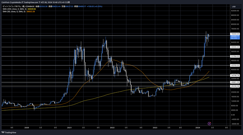 BTC先物の資金調達率も中立水準まで低下しており、半減期相場に向けた上方ブレイクアウトが期待されます。価格は1BTC=71,000ドル〜72,000ドルの範囲まで反発し、ショートポジションに大きな圧力がかかる可能性があります。