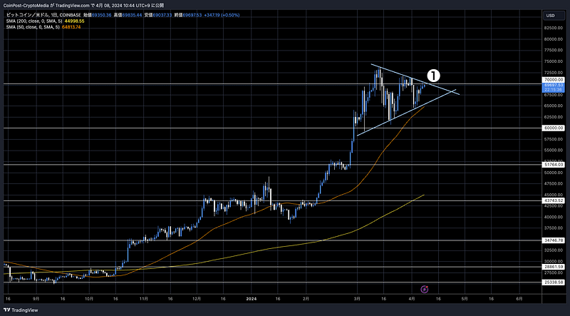 ビットコイン(BTC)は前日比0.25%上昇し、1BTC=69,632ドルまで上昇しました。週足は下髭陰線でクローズし、押し目買いの意欲が見られました。月初には65,000ドルまで急落する場面もありましたが、7日には一時70,000ドル台を回復し、価格の底堅さを示しています。保ち合いを下抜けすると70,000ドルを背にした売り圧力が増す可能性がありますが、上抜けすれば買い手のターンとなり、価格上昇が加速する可能性があります。