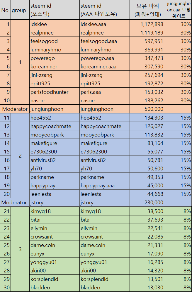 - 매월말일 기준으로 AAA 파워를 산정하여 파워가 많은 순으로 1-2-3 그룹 멤버를 조정하겠습니다.