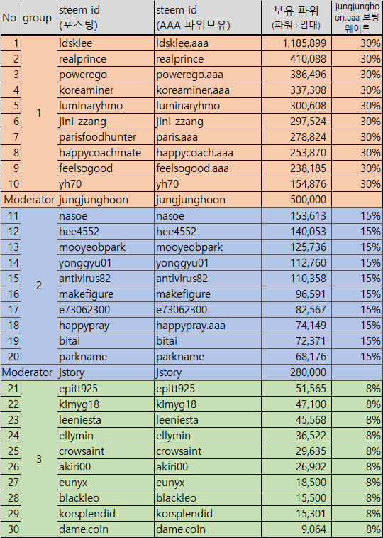 - 현재 @jungjunghoon.aaa 보팅파워는 2천만으로, 30%, 15%, 8% 보팅은 각각 600만, 300만, 160만 AAA 파워로 풀보팅드리는 것과 같습니다.