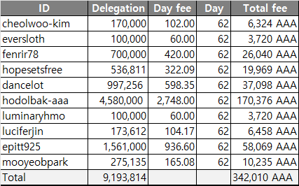 임대수수료 : 100,000 AAA당 일 60 AAA (월말까지 한달 수수료를 선지급 드리며, 수수료율은 추후 변경 가능합니다)
