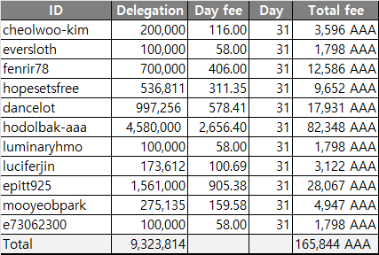 임대수수료 : 100,000 AAA당 일 58 AAA (월말까지 한달 수수료를 선지급 드리며, 수수료율은 추후 변경 가능합니다)