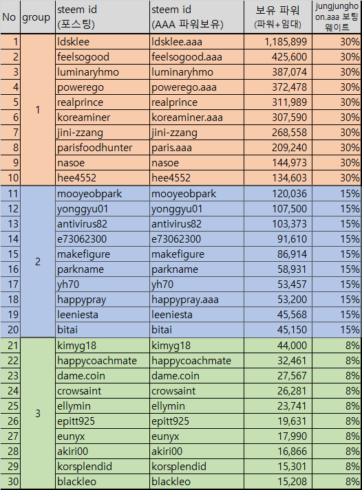 - 매월말일 기준으로 AAA 파워를 산정하여 파워가 많은 순으로 1-2-3 그룹 멤버를 조정하겠습니다.