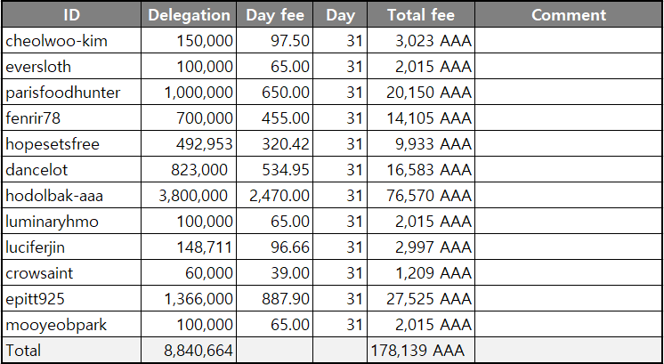 AAA Defi는 AAA 파워를 저에게 임대(delegation)해주시면 매월 이자를 미리 드리는 서비스입니다.