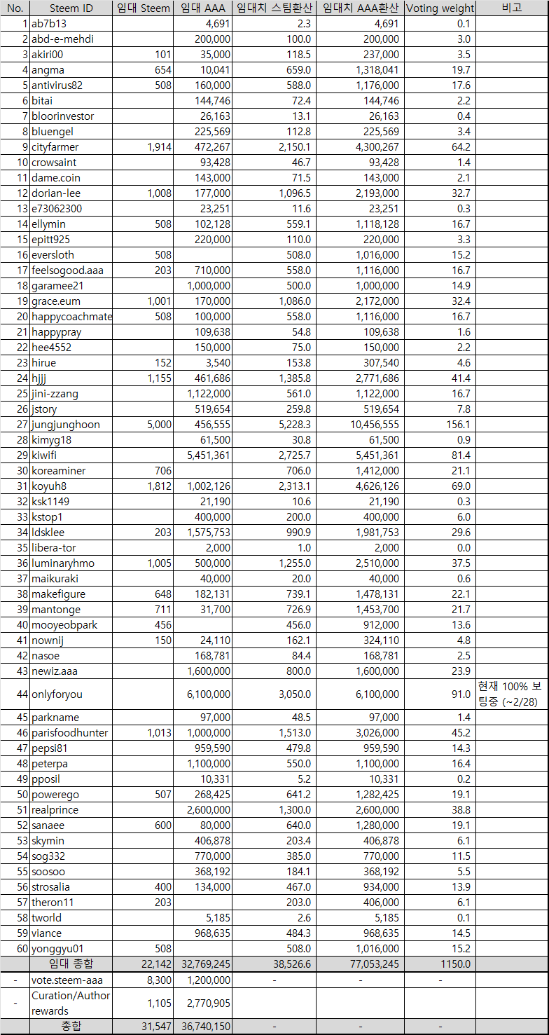 - 하루 1번만 포스팅 작성하는 분에게는 100%를 넘는 부분에 대해서 스팀과 AAA를 지급해 드립니다 (매월 말)