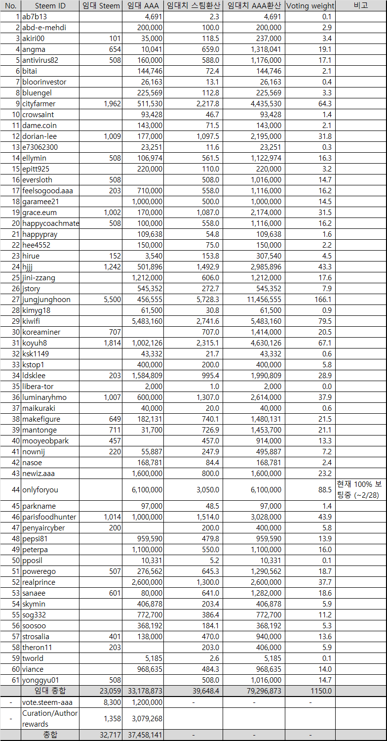 - 하루 1번만 포스팅 작성하는 분에게는 100%를 넘는 부분에 대해서 스팀과 AAA를 지급해 드립니다 (매월 말)