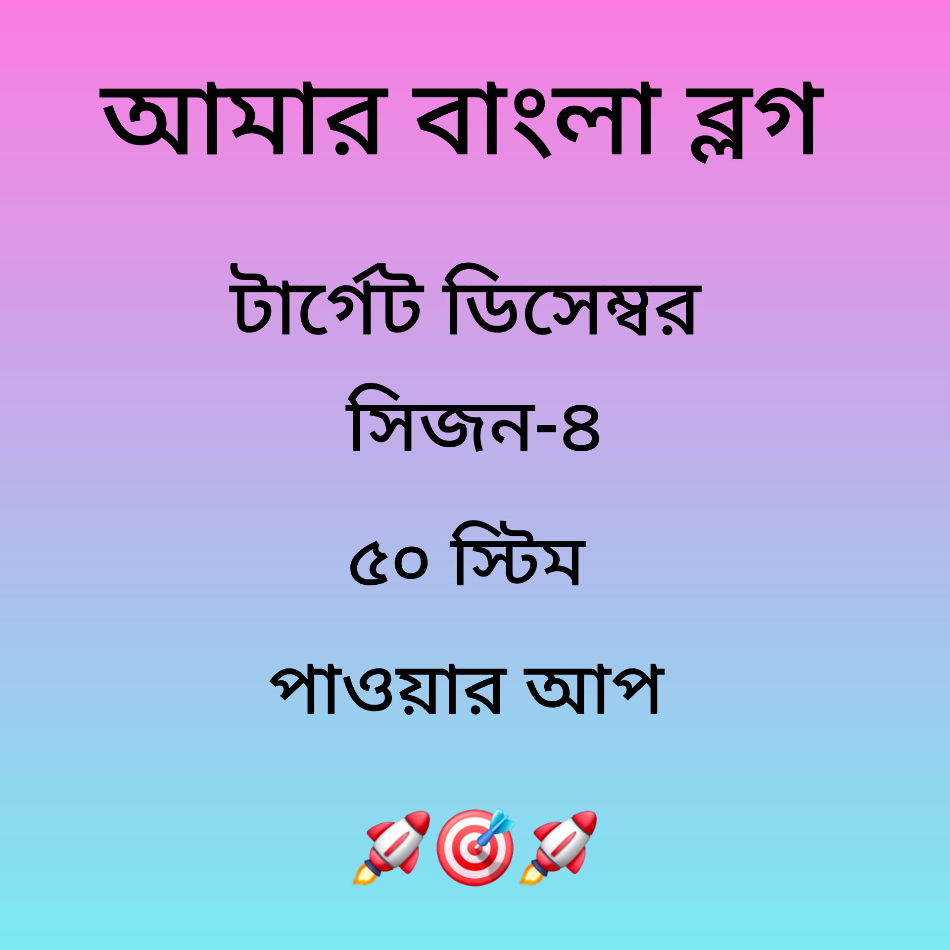 আপনি টার্গেট ডিসেম্বর সিজন ফোর উপলক্ষে আজকে ৫০ স্টিম পাওয়ার আপ করছেন। পাওয়ার আপ করা মানে নিজের আইডির সক্ষমতা বৃদ্ধি করা।আপনার ৫০ স্টিম পাওয়ার আপ দেখে খুবই ভালো লাগলো। আপনাকে অসংখ্য অসংখ্য ধন্যবাদ।