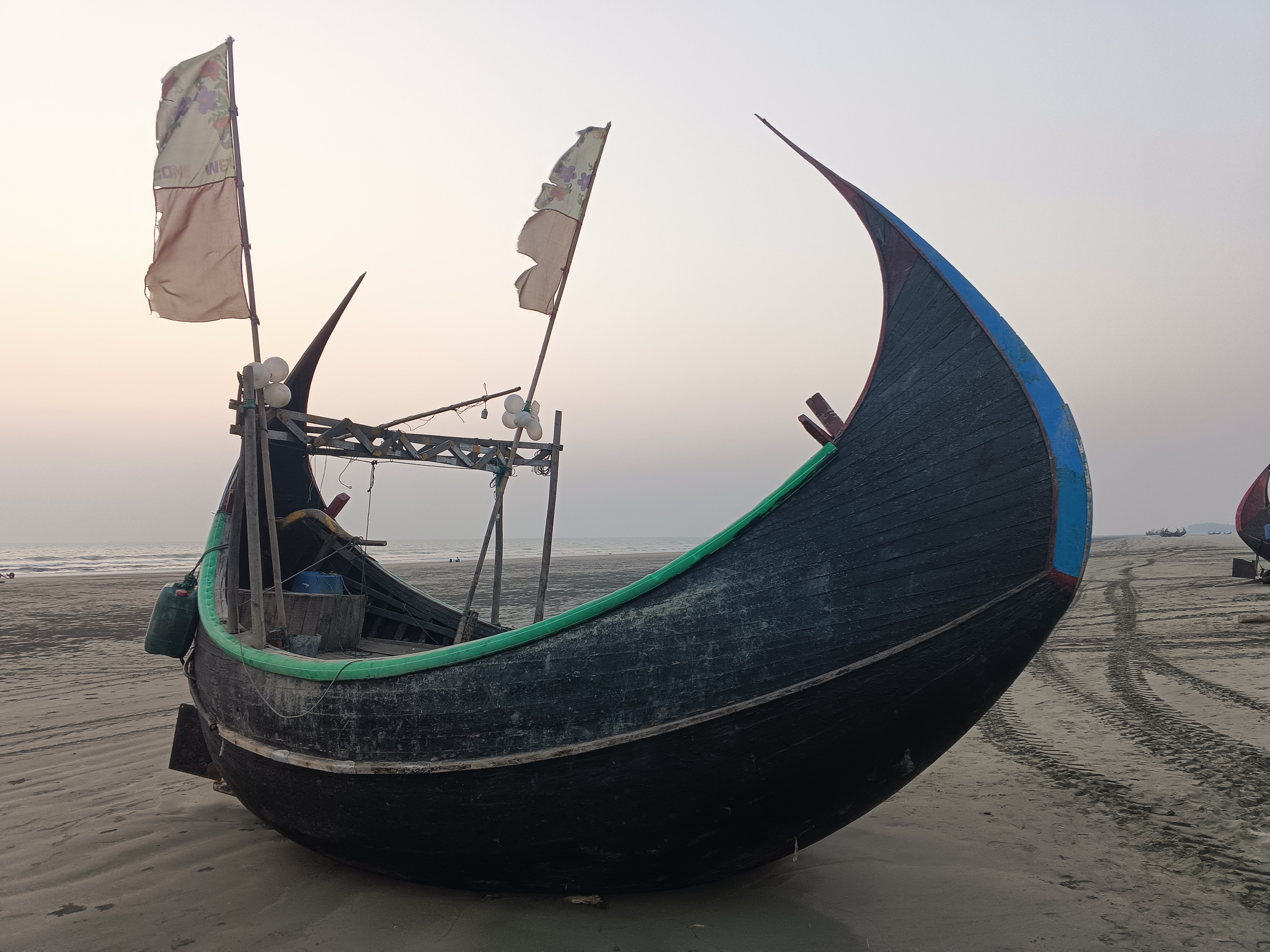 সারা ভারতবর্ষের বিভিন্ন সমুদ্র সৈকত ঘুরেও আমি এমন নৌকা কোনদিন দেখিনি। কিংশুকদার কাছে জানতে পেরেছি বাংলাদেশে এই নৌকাগুলিকে বলা হয় শাম্পান। অদ্ভুত এর গড়ন। শুনলাম বড় বড় ঢেউকে প্রতিহত করে সমুদ্রে এগিয়ে যাওয়ার পক্ষে এই নৌকাগুলি ভীষণ বিজ্ঞানসম্মত ভাবে তৈরি। প্রায় অর্ধচন্দ্রাকর এই নৌকাগুলি মাছ ধরার কাজে বাংলাদেশে বহুল ভাবে ব্যবহৃত হয়। প্রতিটি নৌকা যেন এক একটি সাহিত্যের পটভূমি। সেখান থেকে তৈরি হয় উপন্যাস। অসাধারণ এই শাম্পানগুলি আমি মাঝে মাঝেই ছবিতে দেখি এবং মিশে যাই কোন এক দূর অজানায়।