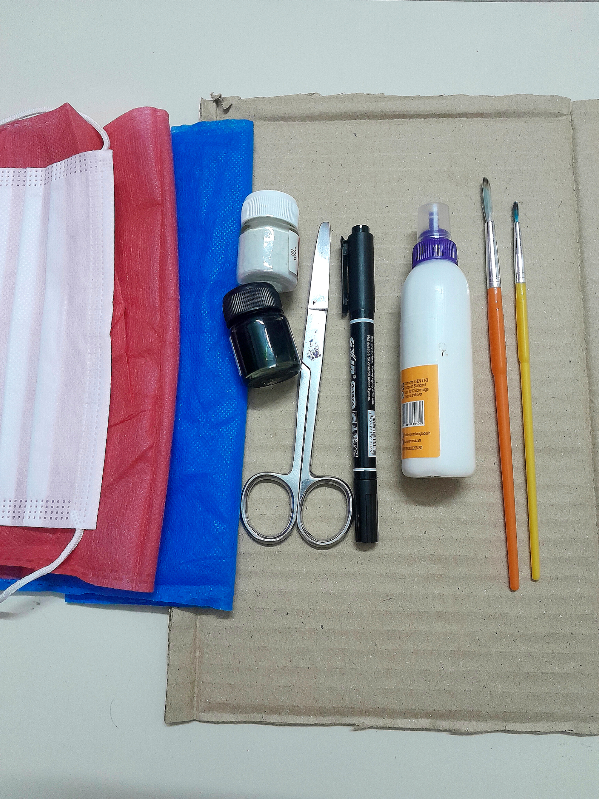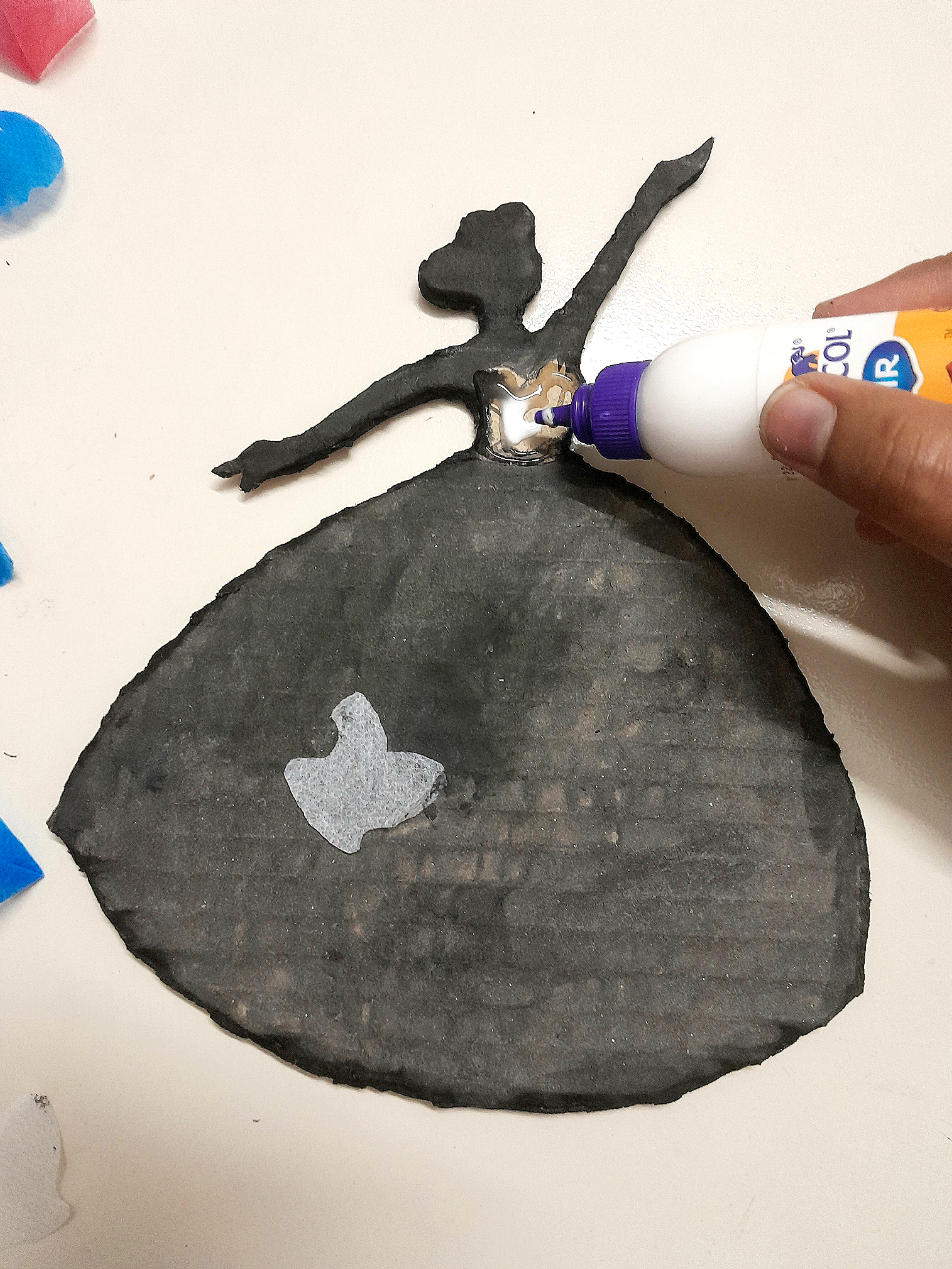 কার্ড বোর্ড দিয়ে তৈরি করা মেয়েটির শরীরের উপরের অংশে একটি সাদা ফেব্রিক লাগিয়ে দিলাম আঠার সাহায্যে এবং সেই কার্ড বোর্ডটির রং শুকানোর জন্য কিছু সময় রেখে দিলাম।