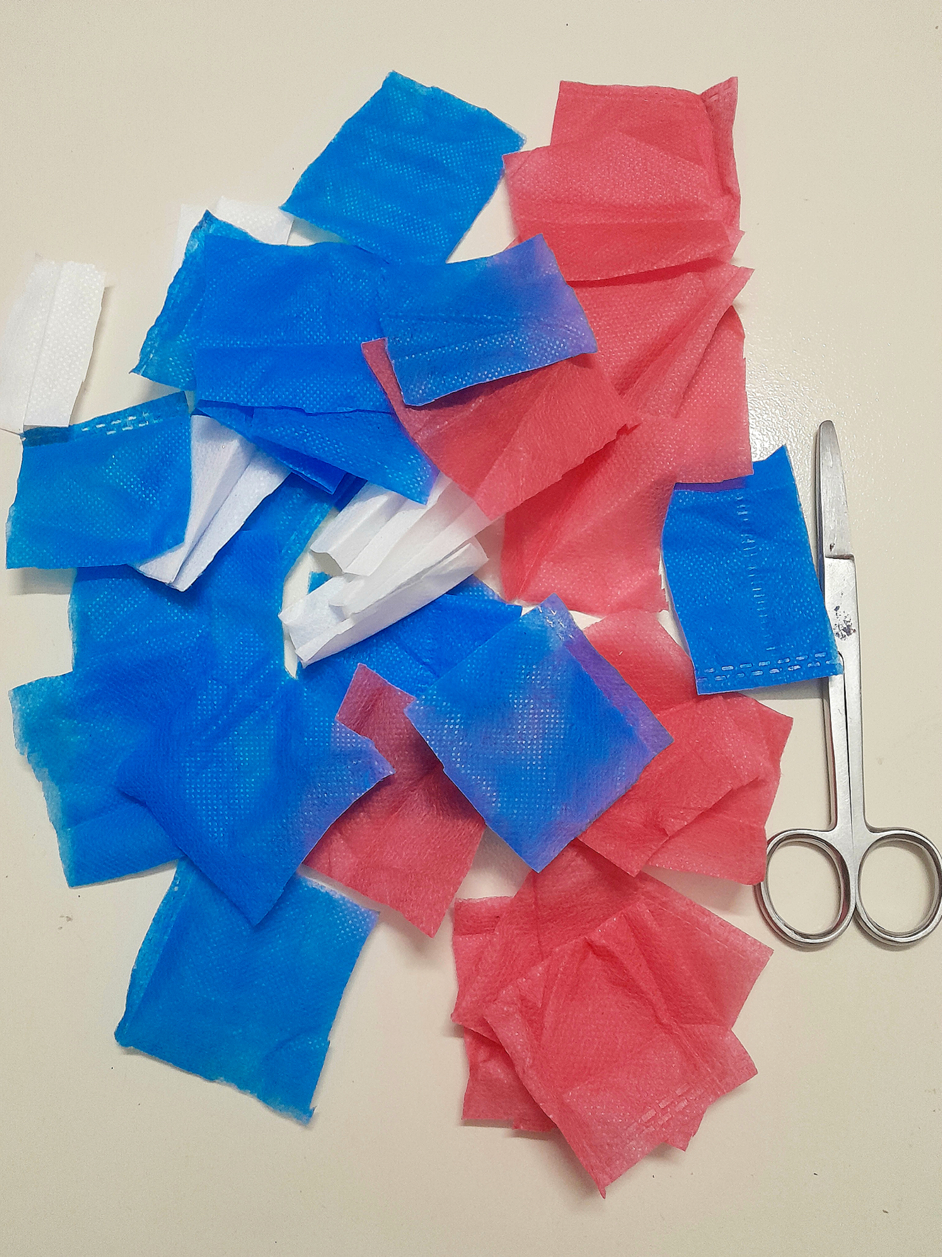 মাস্ক ও মাস্ক এর মত ফেব্রিক যুক্ত ব্যাগ দুটিকে প্রথমে ছোট ছোট চারকোনা করে কেটে নিলাম এবং পরে সেগুলোকে অনেকটা গোল গোল করে কেটে নিলাম।
