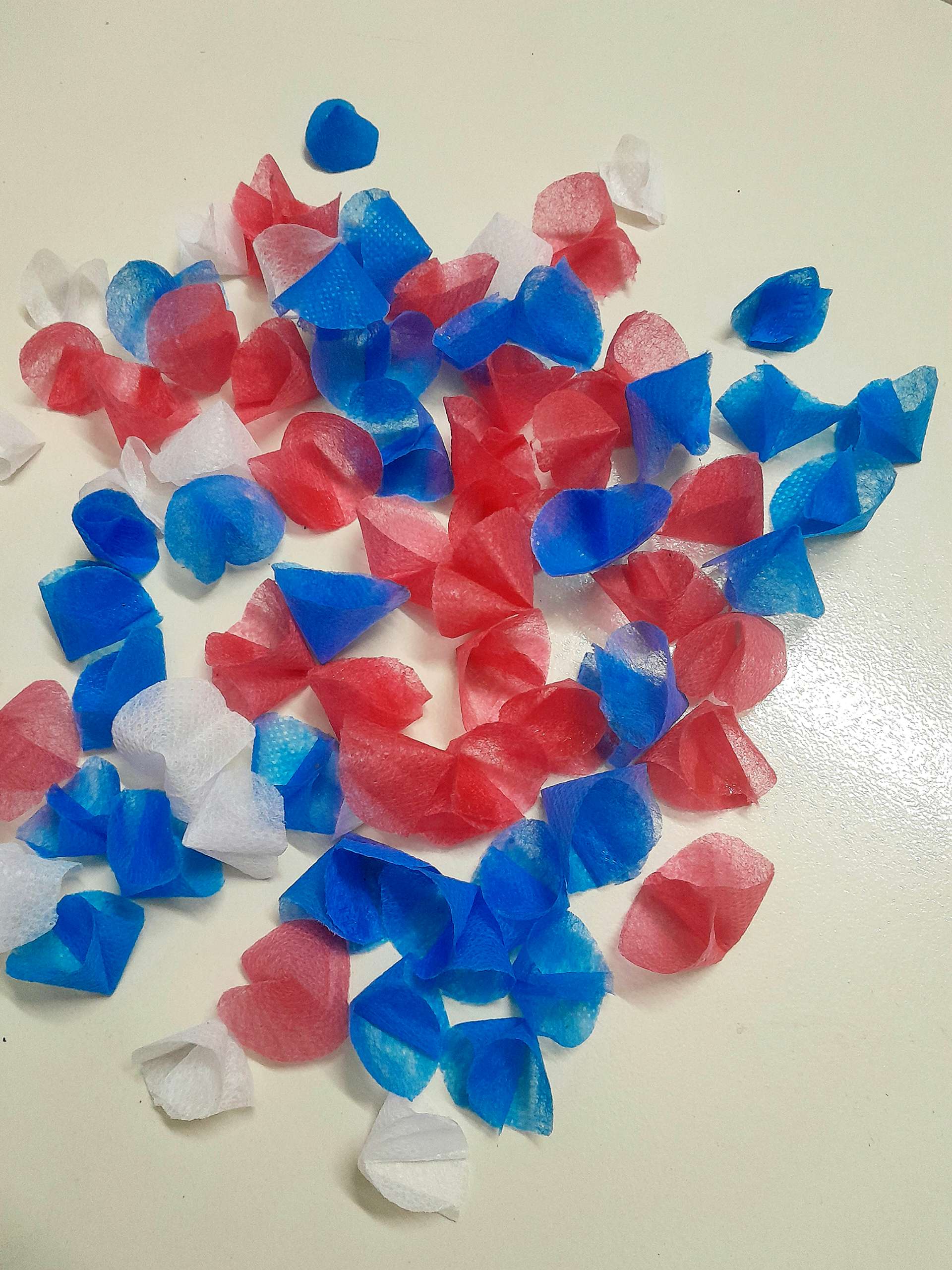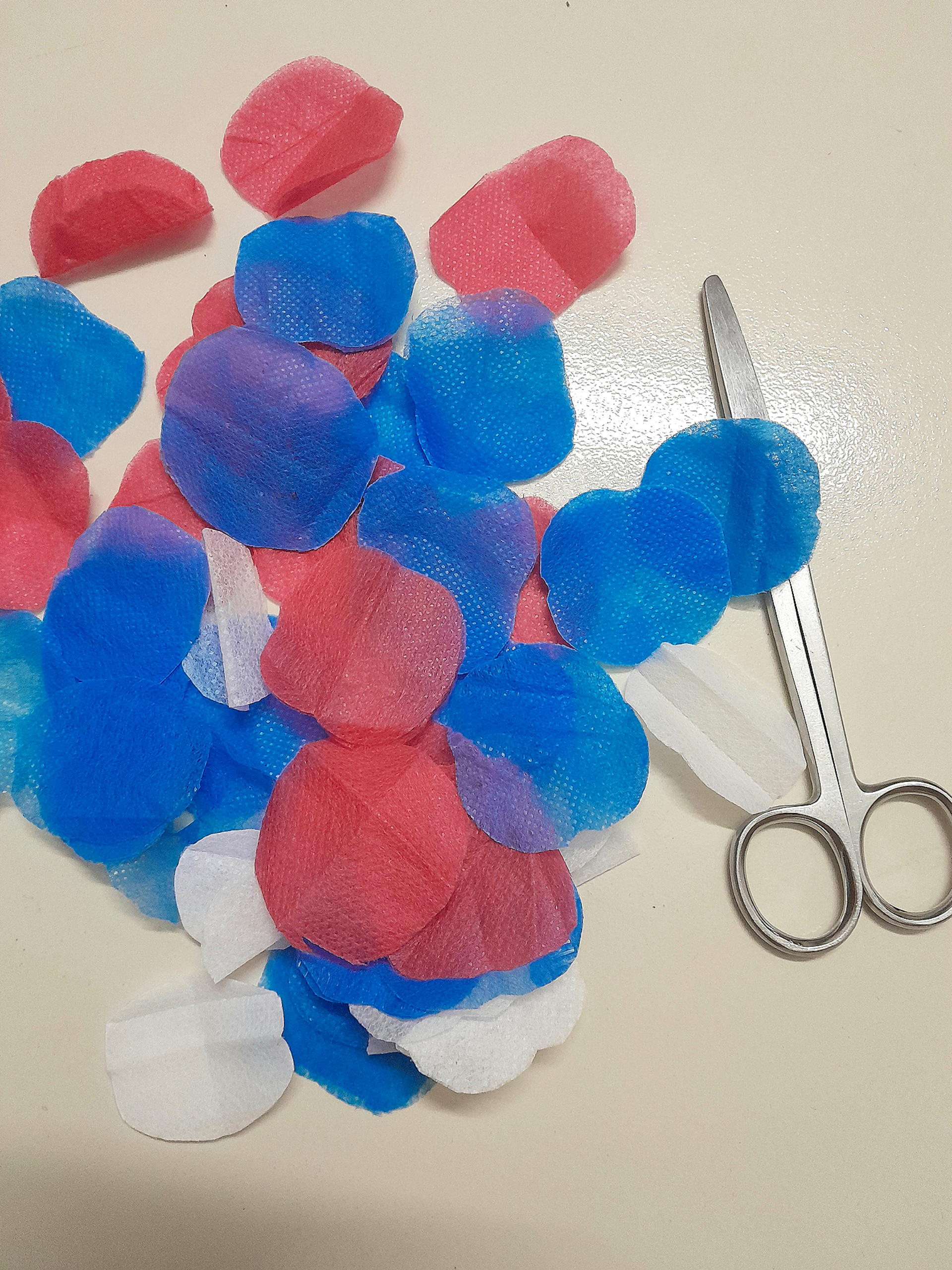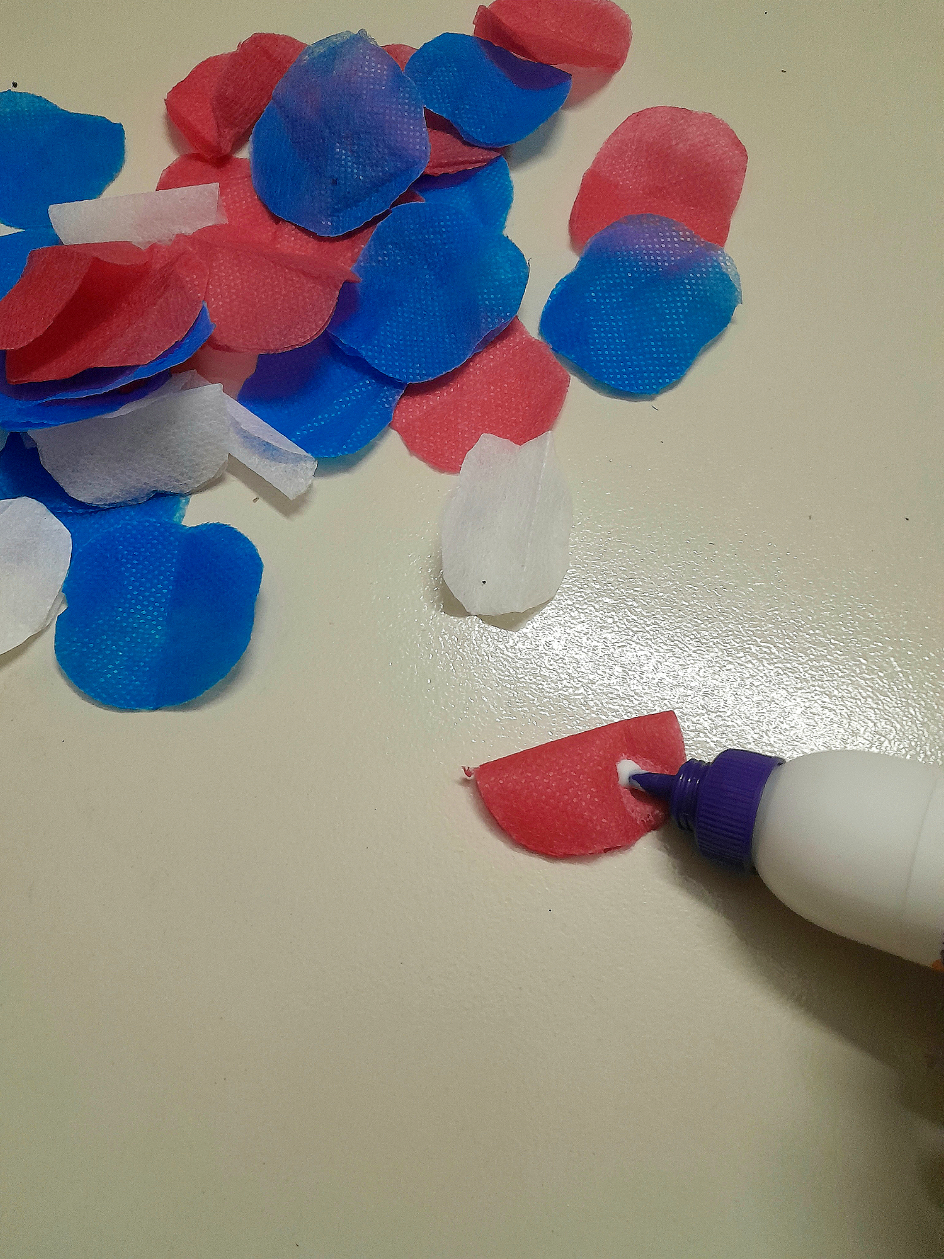 চিত্রের মত করে ফেব্রিক গুলোতে আঠা লাগিয়ে ফুলের পাপড়ির মত করে নিলাম।