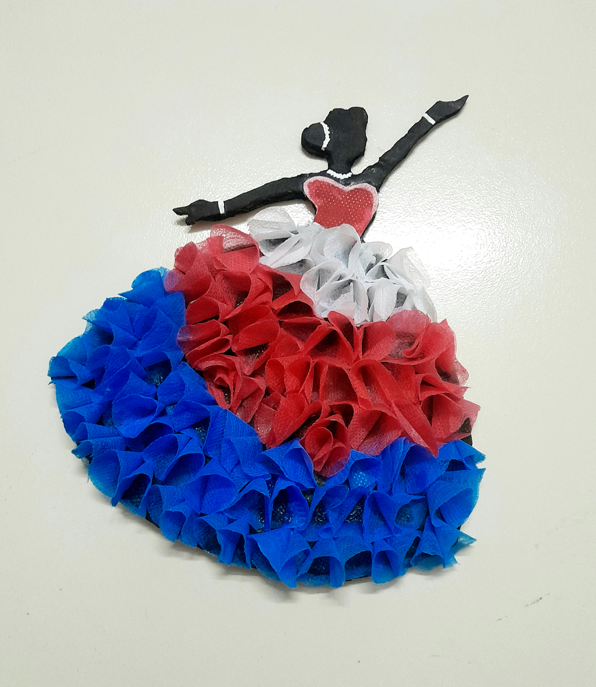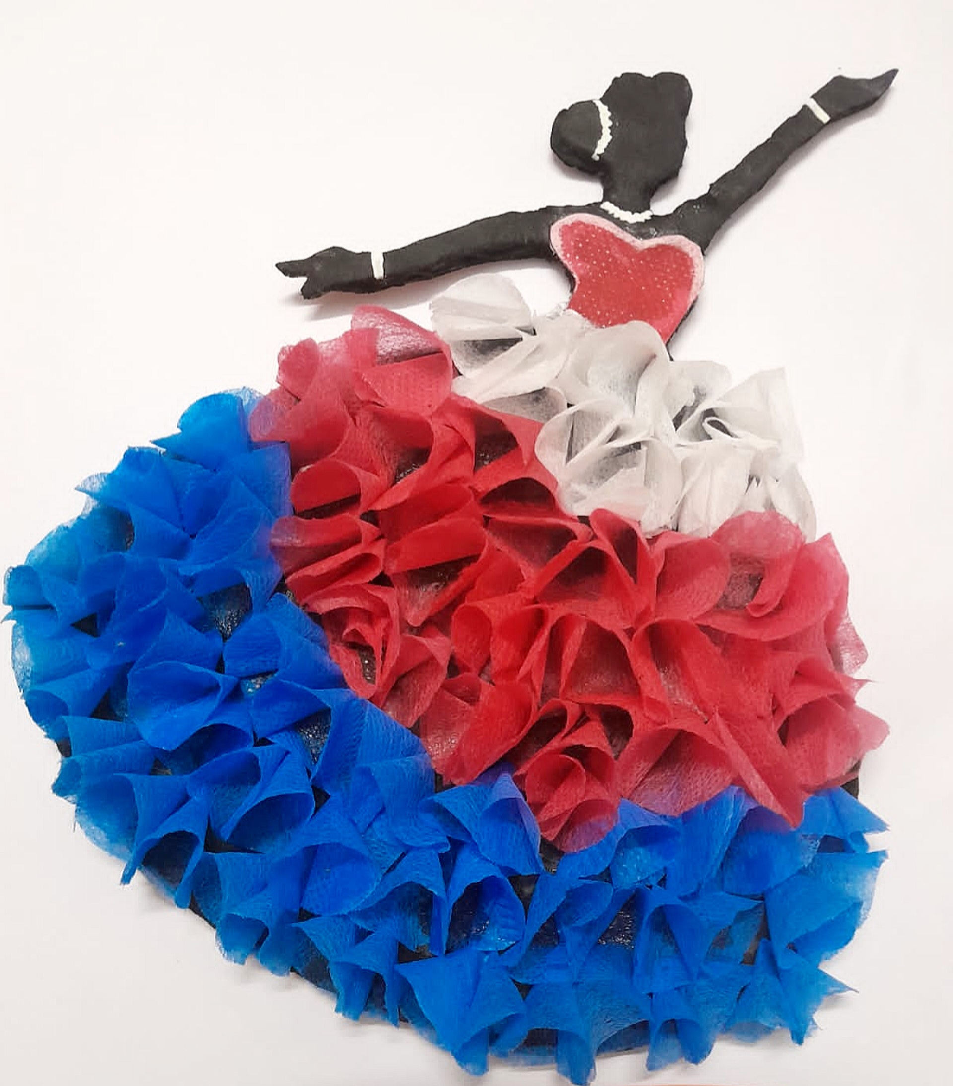 চতুর্থ ধাপে যে ফেব্রিক গুলোকে ফুলের পাপড়ির মতো তৈরি করে রেখেছিলাম সেগুলোকে কেটে রাখা কার্ড বোর্ডের বিভিন্ন অংশে সুন্দর করে লাগিয়ে দিলাম। ফেব্রিক গুলো লাগানোর পর কার্ড বোর্ড দিয়ে তৈরি করা একটি মেয়ের নৃত্য করার দৃশ্যটি খুব সুন্দরভাবে ফুটে উঠবে। এবার নৃত্য করা মেয়েটির হাতে, গলায় এবং চুলের খোঁপায় কিছুটা সাদা রঙ এর শেড টেনে দিলাম । এভাবেই আমার আজকে কার্ড বোর্ড দিয়ে তৈরি করা একটি মেয়ের নৃত্য করার দৃশ্য সম্পন্ন হল।