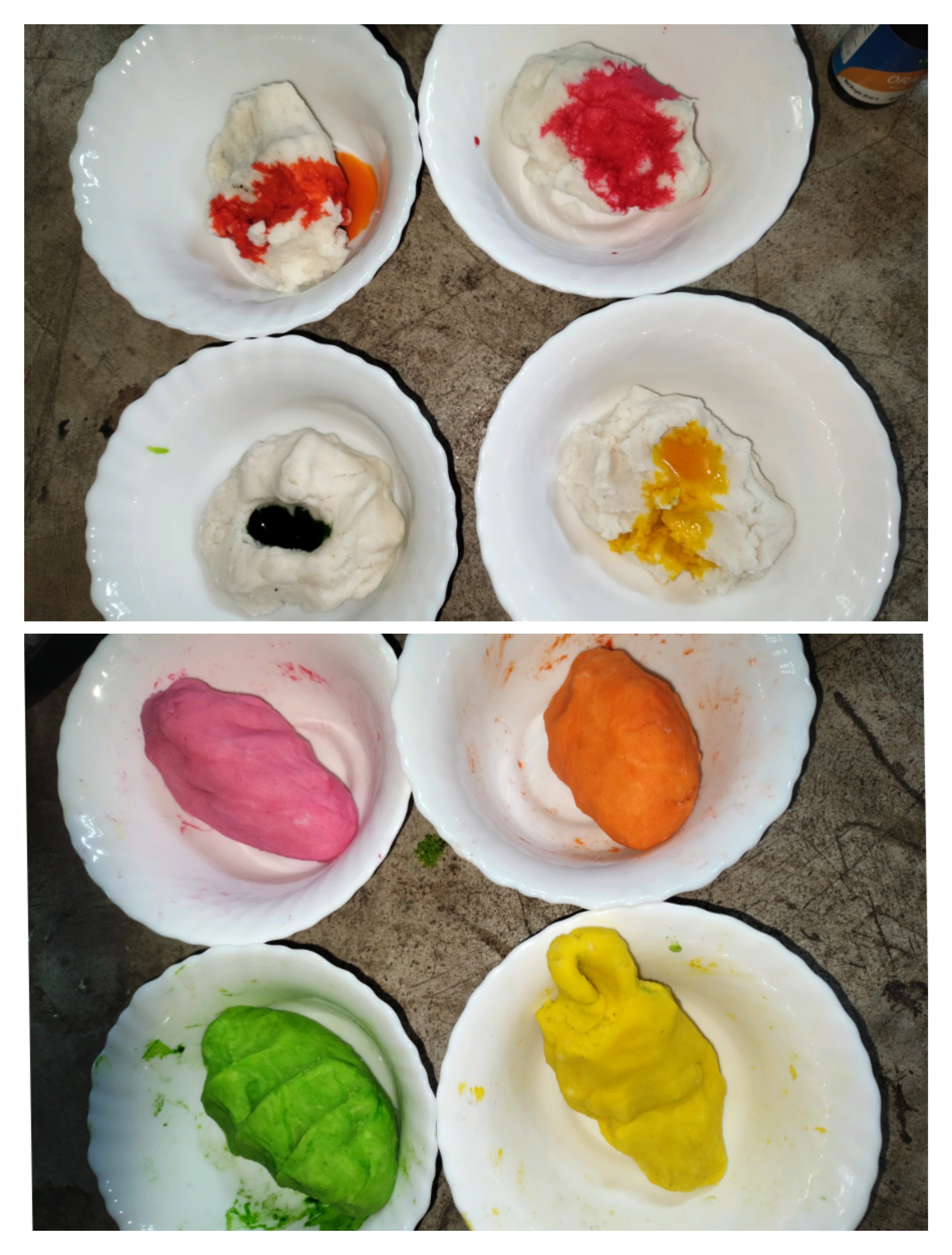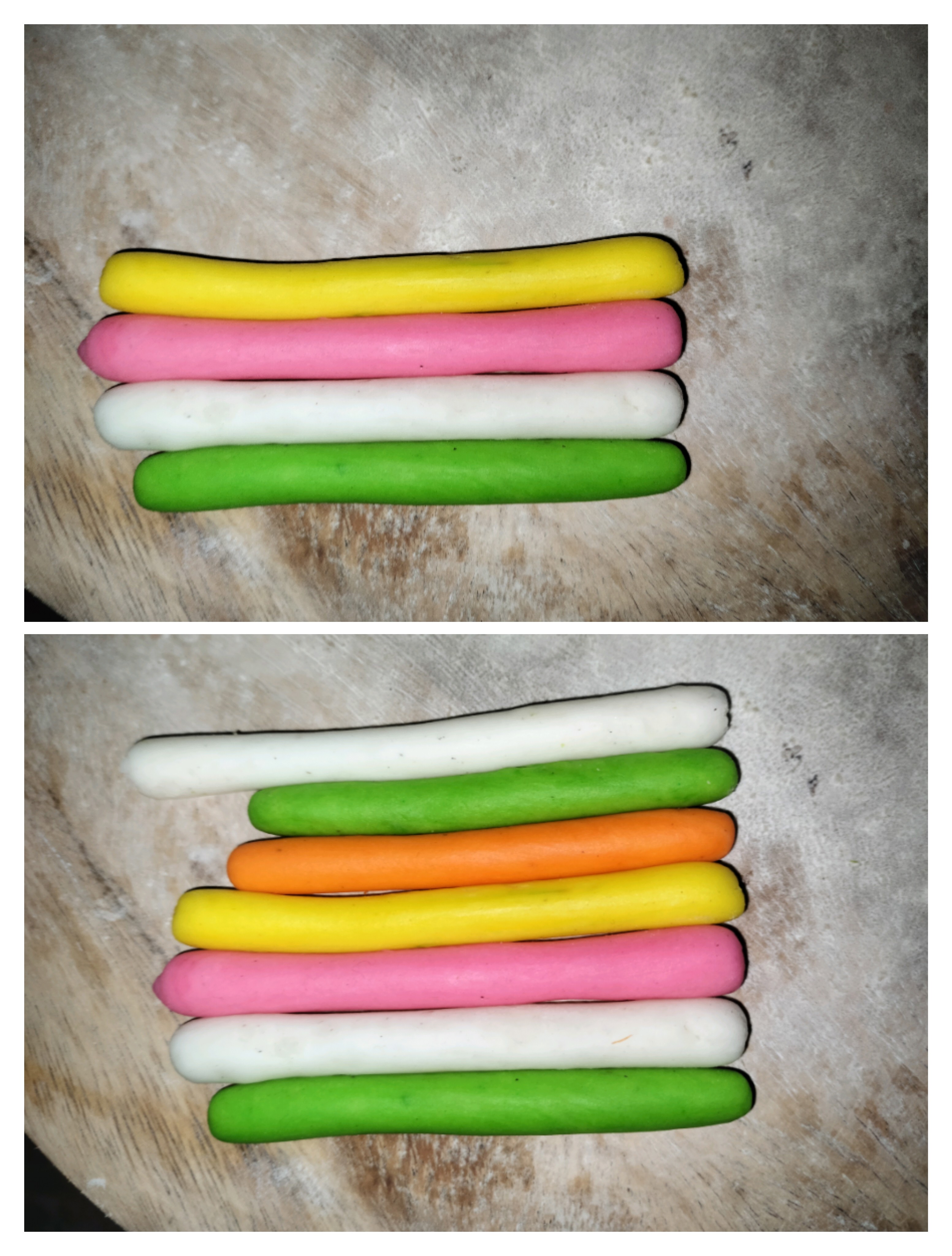 এরপর আমি সবগুলো দো থেকে একটু একটু করে নিয়ে গোল করে লম্বা একটা আকৃতি তৈরি করে নিলাম। এরপর একটা কালার এর সাথে একটা কালার মিশিয়ে নিলাম।