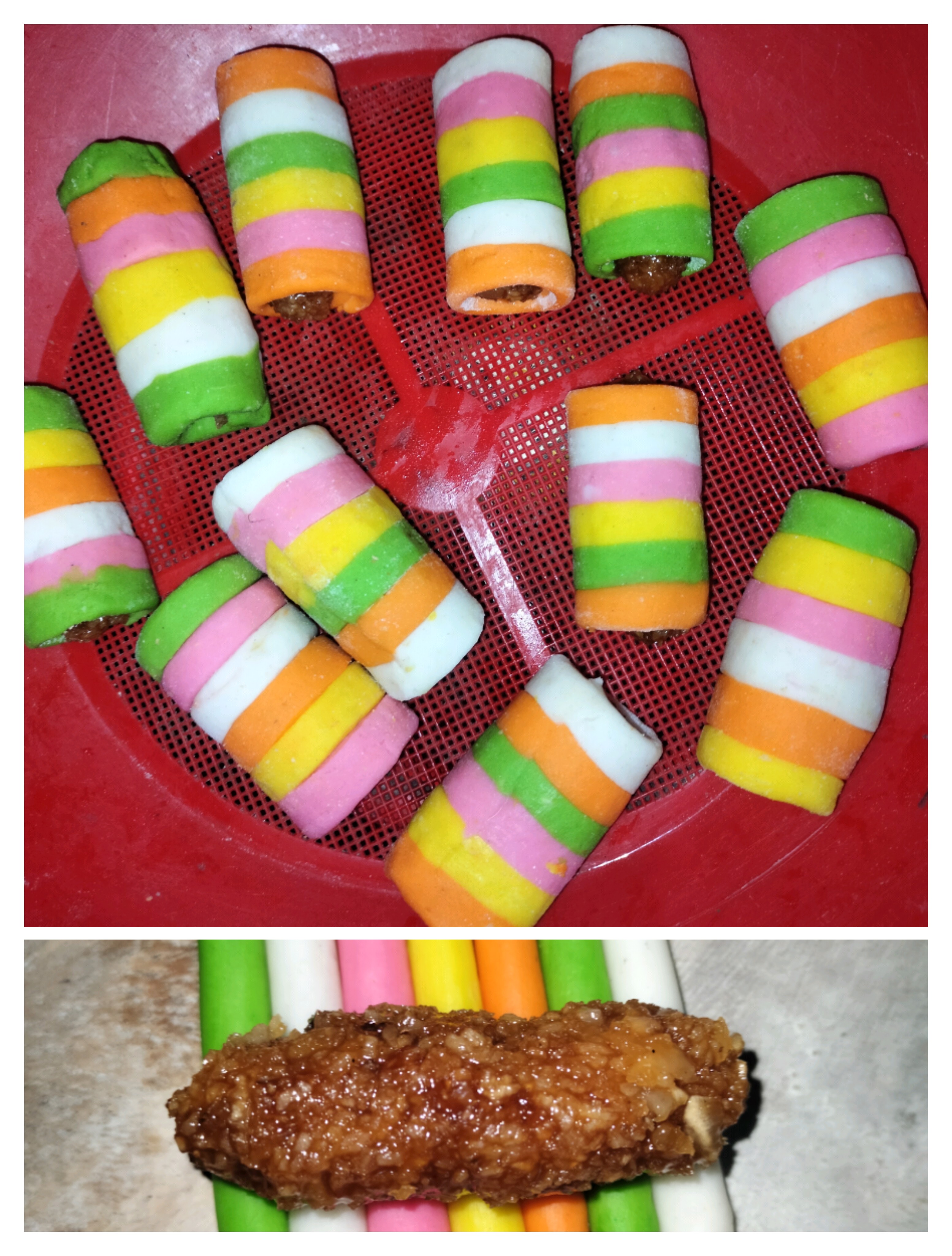 মাঝখানের অংশে গুড় আর নারিকেলের একটা দল আরম্বা করে এর উপরে বসিয়ে এরপর কালার গুলো পেঁচিয়ে নিলাম।