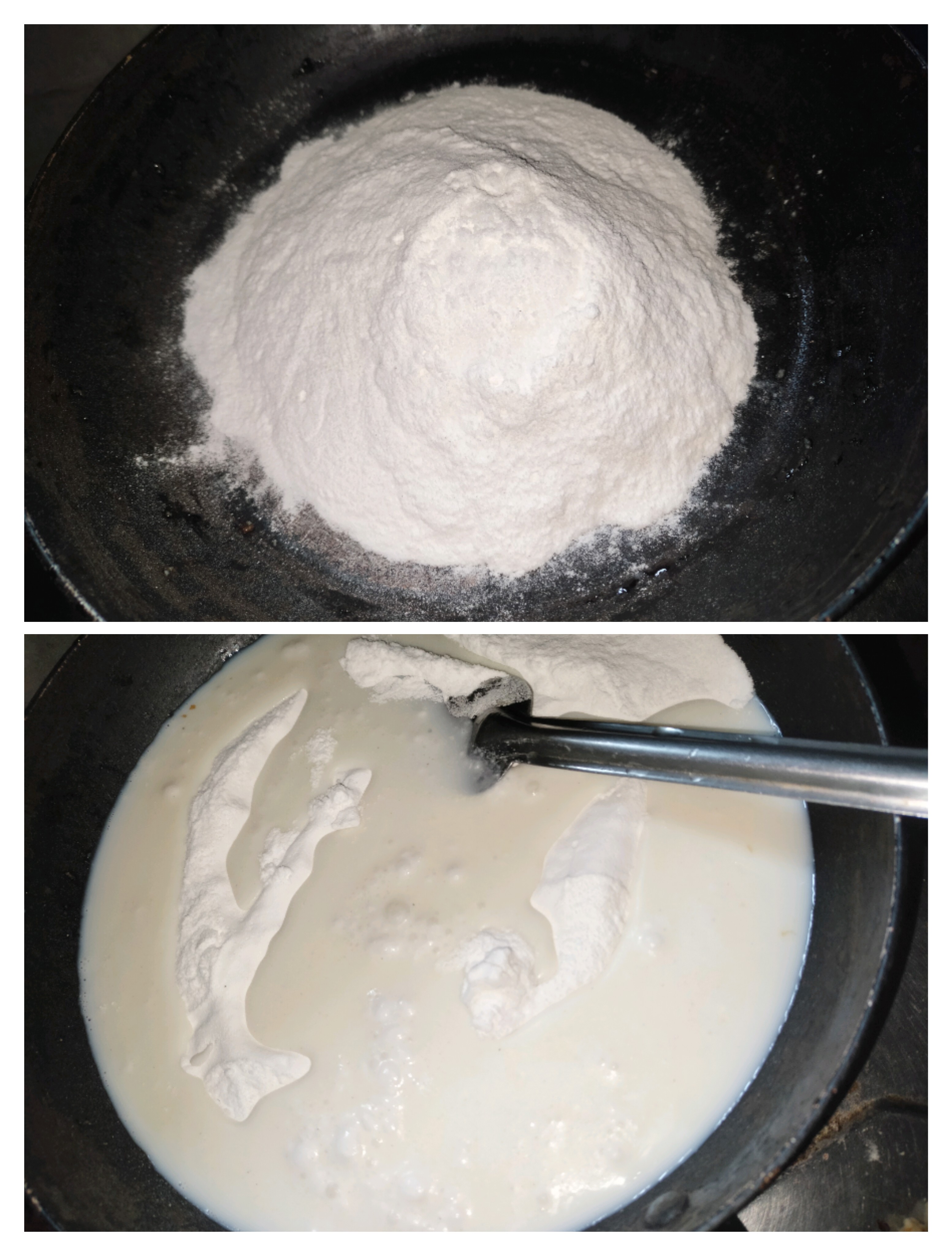 এরপর আমি আবারও একটি চুলায় বসিয়ে দিলাম। এরপরের মধ্যে পরিমাণ মতো লবণ এবং লিকুইড দুধ দিয়ে দিলাম