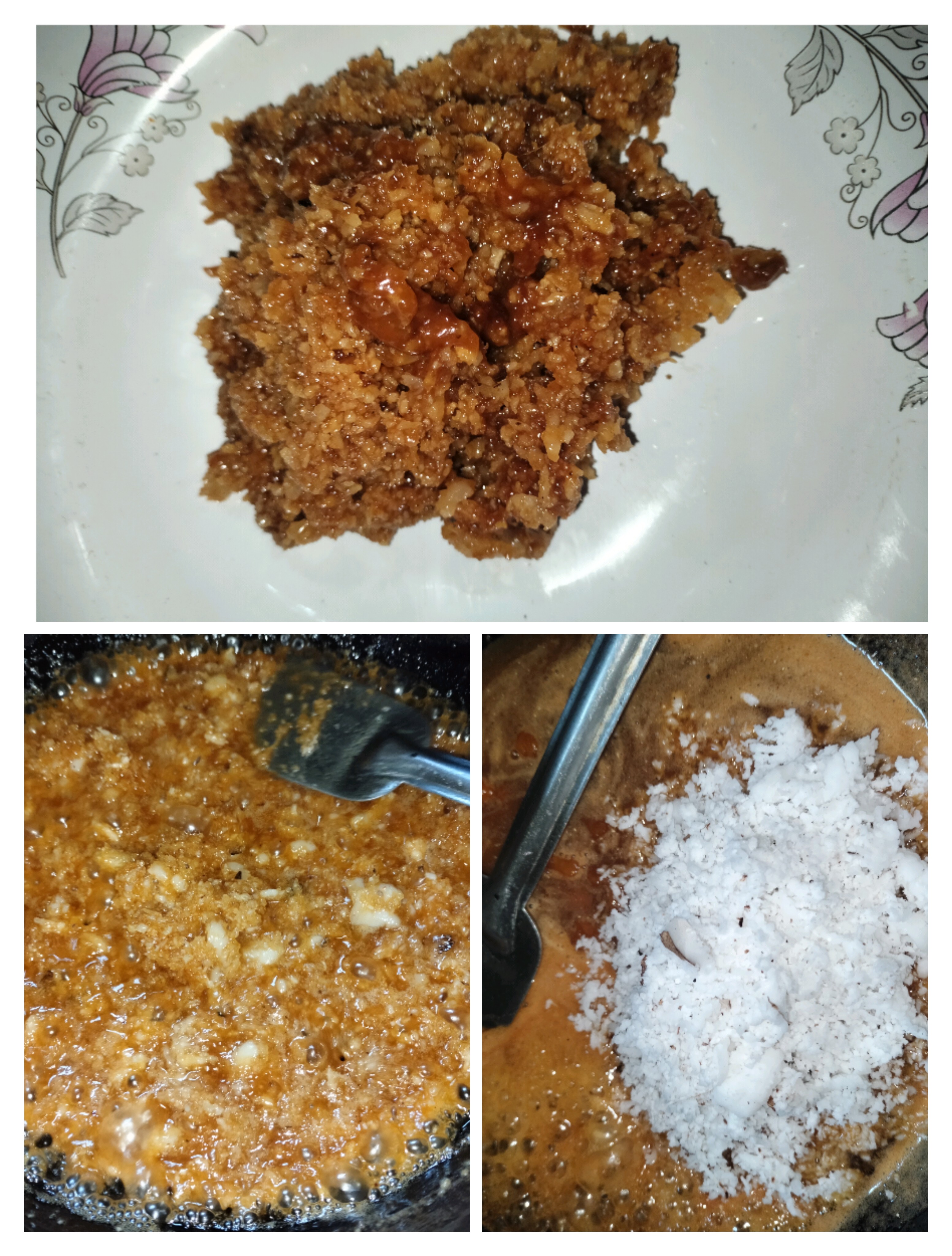 এরপর ইমুতে নারিকেল পরানো দিয়ে বেশ কিছুক্ষন চুলায় রেখে একেবারে শুকিয়ে নিলাম। এরপর নারিকেল আর গুড়ের মিশ্রণটাকে নামিয়ে নিলাম।