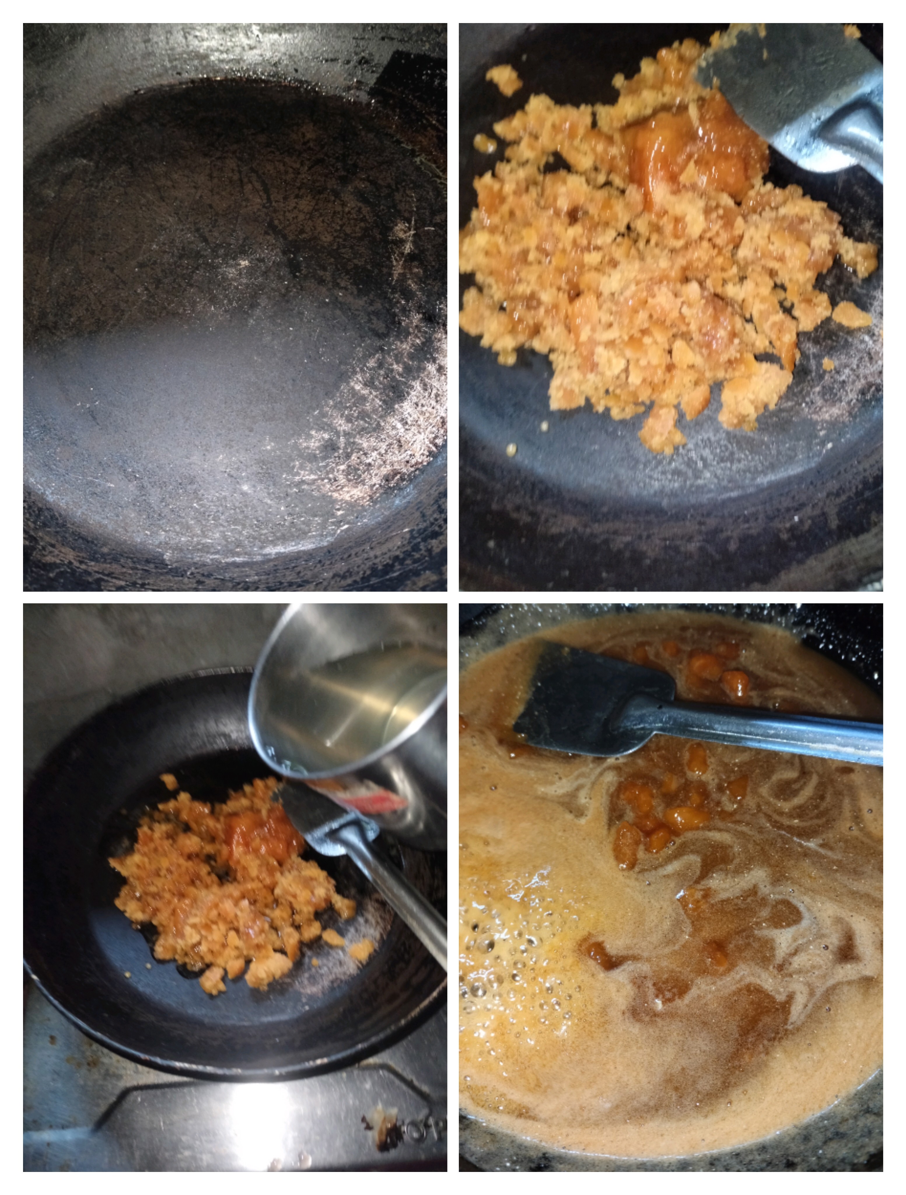 এরপর আমি চুলা একটি ফ্রাইপ্যান বসিয়ে দিলাম। এরপরে এর মধ্যে গুঁড় দিয়ে দিলাম। এরপরের মধ্যে সামান্য পরিমাণে পানি দিয়ে দিলাম।