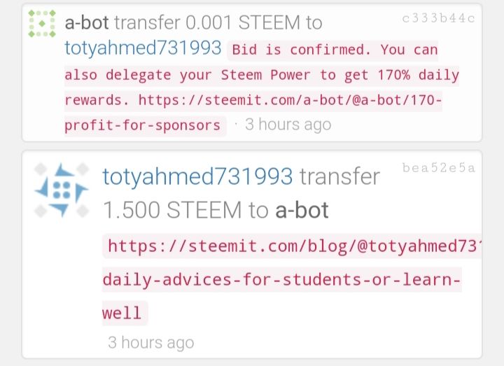 hello, I have sent you a bid of 1.5 steem 3 hours ago and you said bid is confirmed and I did not get anything txid:bea52e5aa21679f1f854ef6b2c7103c808bc05ab (please check)