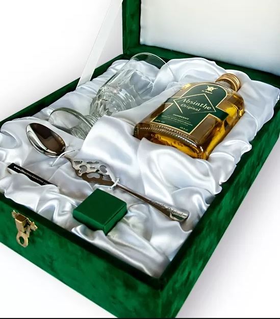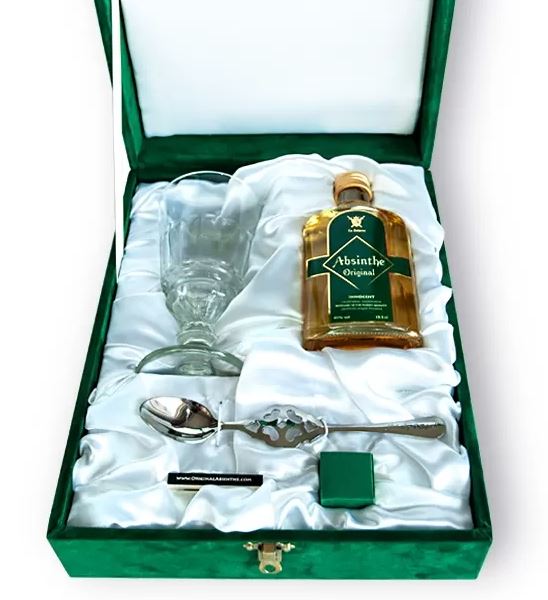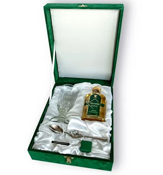 Want to find the perfect and unique gift? Deliver this great gift box to your door along with your own personal message card. This silk-faced absinthe gift package is no cheap drop - handmade from the finest materials and attention to detail, this luxurious Absinthe Original gift idea is a sensational way to show your love.