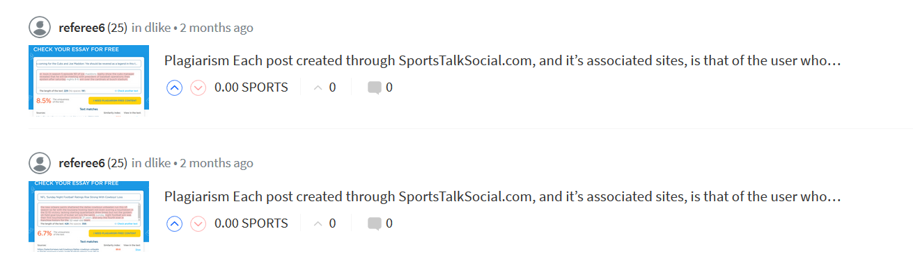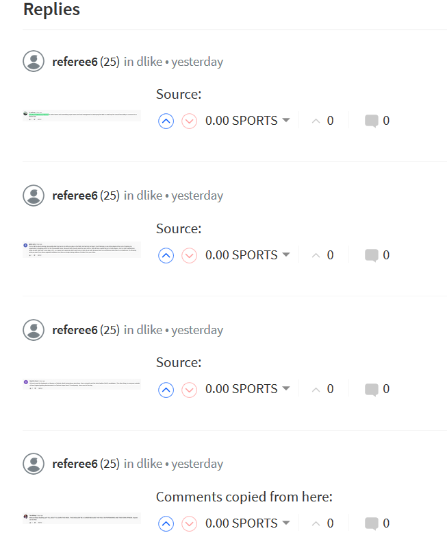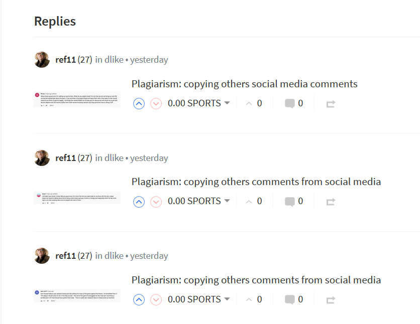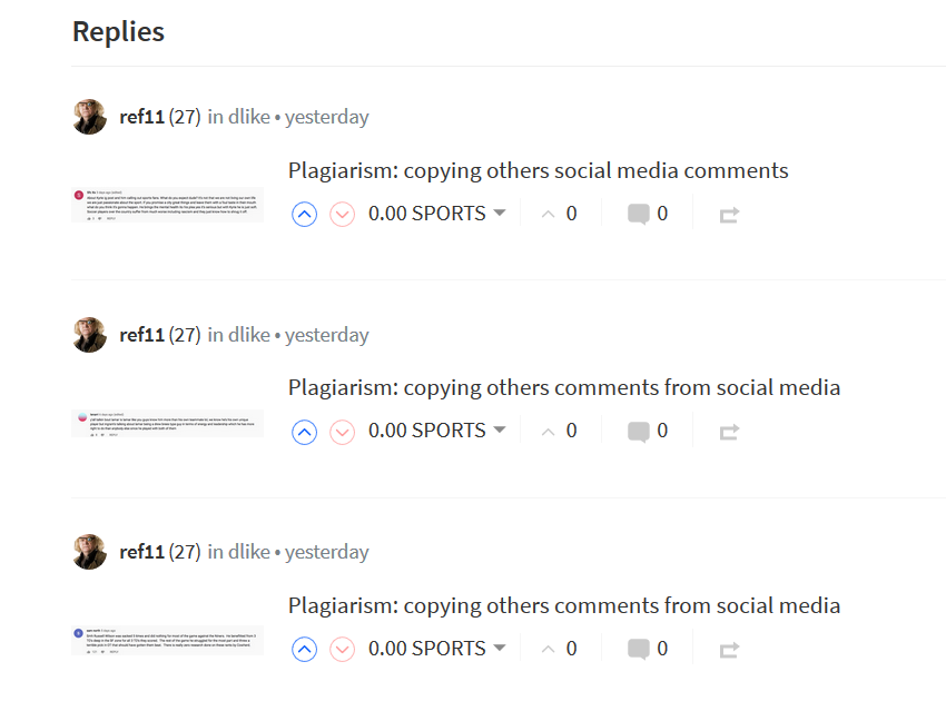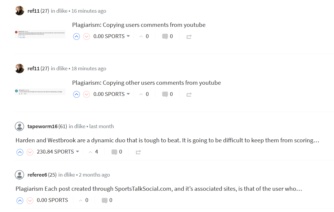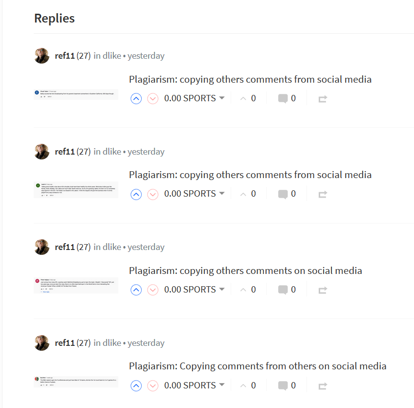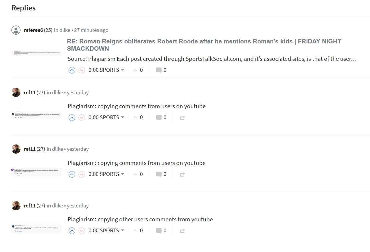 The other day @ref11 has checked his posts for the last 7 days and all his posts are plagiarized, all copy paste comments from YouTube.