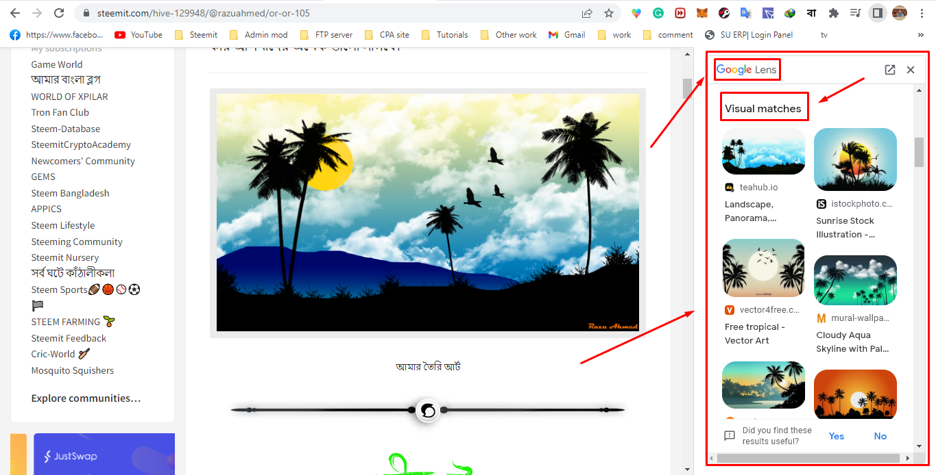 এবার দেখবেন পাশে একটি নতুন মেনু চালু হবে। নতুবা আলাদা একটি ওয়েব পেজ চালু হবে। যেখানে Google Lens চালু হবে। তারপর ভিউজুয়ালি ম্যাচ করে সেই ইমেজ গুলা দেখতে পারবেন। ধরুন আমি যদি এখানের কোনো আর্ট দেখে দেখে আর্ট করতাম তাহলে এখানের কোনো আর্ট এর সাথে আমার মিলে যেতো সেটি গুগল ধরে ফেলে আপনার সামনে হাজির করতে পারতো। তখন আপনি বুঝতে পারবেন আসলে এখানে এবিউজ হয়েছে।