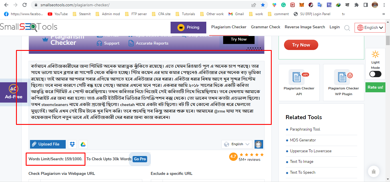 এবার আপনাদের শেখাবো কোনো লেখার plagiarism কিভাবে চেক করবেন। এটা ফ্রিতে করা যায়। তাই খুব বেশি একটা কাজের না। তবে নিজের লেখা গুলো সব সময় আপনি যাচাই করে নিতে পারবেন। অনেক সময় দেখা যায় অনিচ্ছাকৃত প্লাজিয়ারিজম এর শিকার হতে হয়। তা থেকে আপনি বাচতে পারবেন। আবার কারো লেখা দেখে সন্দেহ হলে নিজেই যাচাই করতে পারবেন। এর জন্য প্রথমেই আপনাকে - https://smallseotools.com/plagiarism-checker/ এই লিংক এ যেতে হবে। তারপর সেখানে একটি বক্স দেখতে পাবেন সেখানে আপনার যে লেখা গুলো চেক করবেন সেগুলো দিবেন। তবে এখানে লিমিটেশন রয়েছে। এক্ষেত্রে আপনি এক বারে ১০০০ শব্দ চেক করতে পারবেন।