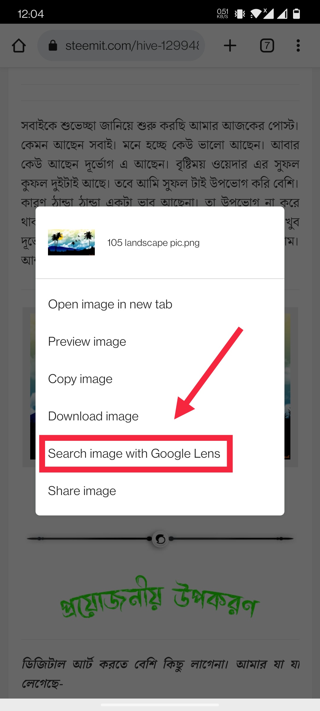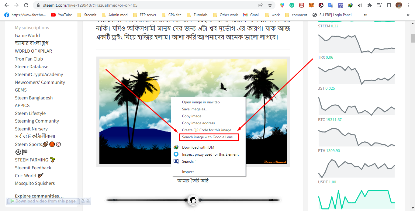 এই ধাপে আপনি যে আর্ট বা ছবি চেক করবেন সেটি ওপেন করবেন। যেমন আমি আমার পোস্ট এর আর্ট চেক করে দেখাবো। তাই সেটি ওপেন করলাম। এবার ছবিতে মাউস পয়েন্টার নিয়ে মাউস এর রাইট বাটন এ ক্লিক করলে দেখবেন কিছু অপশন দেখাচ্ছে। সেখান থেকে Search image with Google Lens এই অপশনটিতে ক্লিক করবেন।