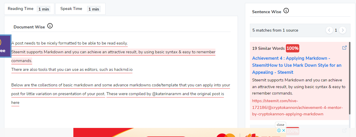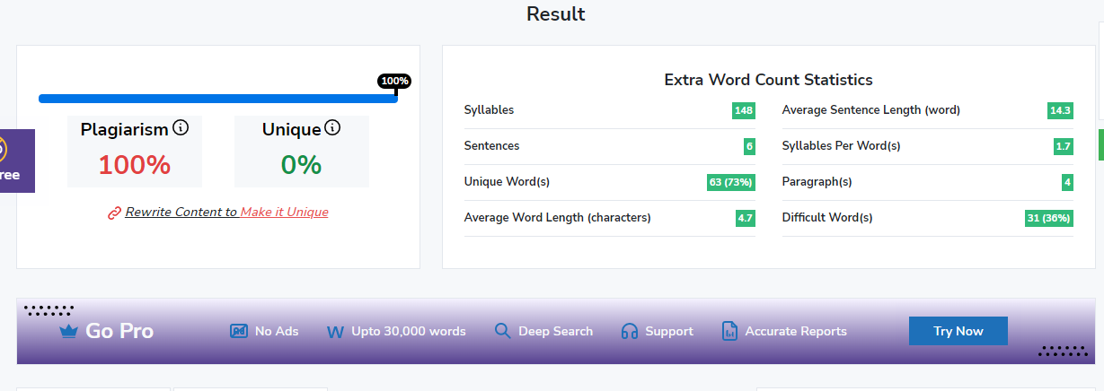 রেজাল্ট এ আপনি অনেক কিছুই দেখতে পারবেন। যা উপরের এই স্ক্রিন শট এ দেখতে পাচ্ছেন। এখন আপনাদের মনে প্রশ্ন আসতে পারে যে তাহলে Plagiarism পোস্ট এর রেজাল্ট কেমন হতে পারে। এর জন্য একটি রেজাল্ট দেখাচ্ছি -
