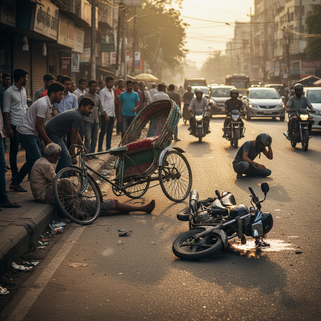 একটি মোটরসাইকেল খুব দ্রুতগতিতে ছুটে আসছিল। আমি চোখ তুলে দেখলাম চালক হেলমেট পরা, তবে গতি এত বেশি যে মনে হচ্ছিল যেন সে উড়ে যাচ্ছে। ঠিক তখনই সামনে দিয়ে একটি রিকশা ঘুরে যাচ্ছিল রাস্তা পার হওয়ার জন্য। চোখের পলকেই মোটরসাইকেলটি রিকশাটিকে জোরে ধাক্কা মারে। মুহূর্তের মধ্যে সবকিছু ওলটপালট হয়ে গেল।ধাক্কা খেয়ে রিকশাটি উল্টে যায়। রিকশায় থাকা যাত্রী একজন বয়স্ক মানুষ ছিটকে পড়লেন রাস্তায়। রিকশাওয়ালাও গিয়ে পড়লেন পাশের ড্রেনের ধারে। মোটরসাইকেল চালকটি ছিটকে পড়ল অনেকটা দূরে, রাস্তার মাঝখানে। দৃশ্যটা এত হঠাৎ ঘটে গেল যে আশপাশের সবাই স্তব্ধ হয়ে গেল। কয়েক সেকেন্ড কেউ কিছু বুঝে উঠতে পারছিল না। এরপরই শুরু হলো চিৎকার, দৌড়ঝাঁপ, সাহায্যের আহ্বান।