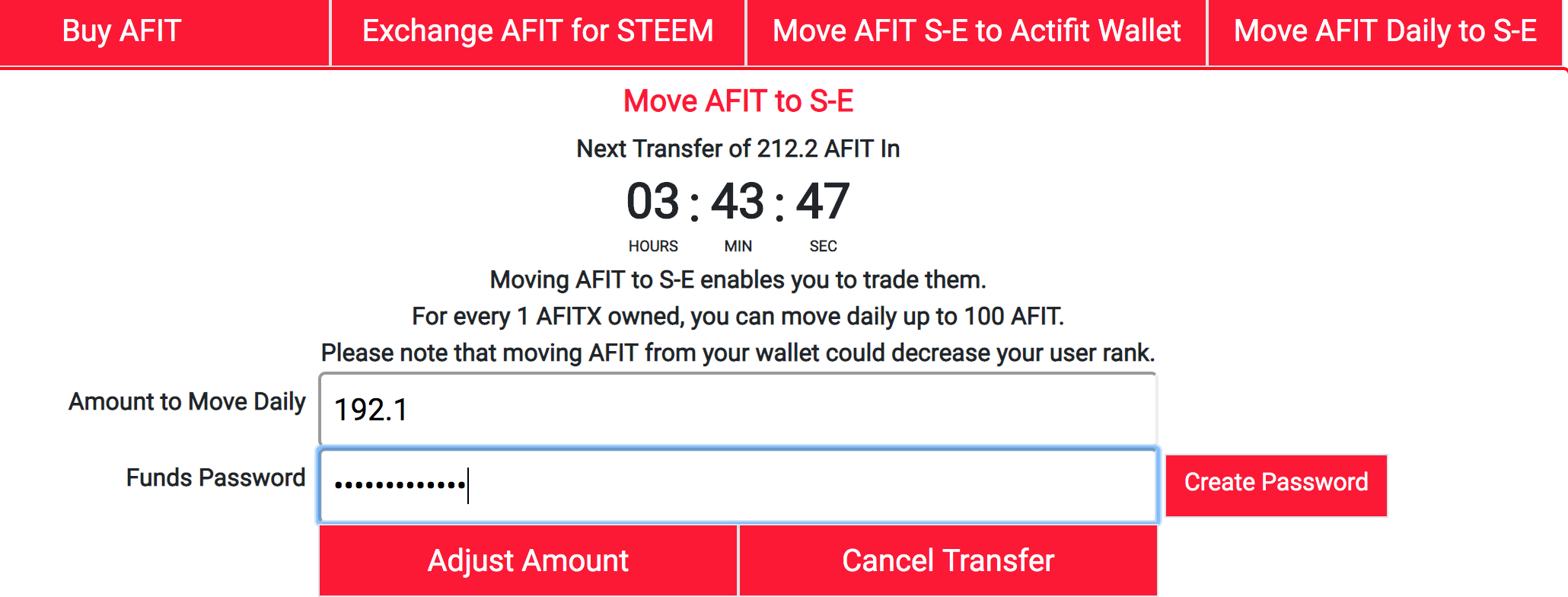 "Move AFIT Daily to S-E"をクリックし、S-Eに送信するAFITの量("Amount to Move Daily")とファンドパスワード("Funds Password")を入力し、送信設定を完了させます。