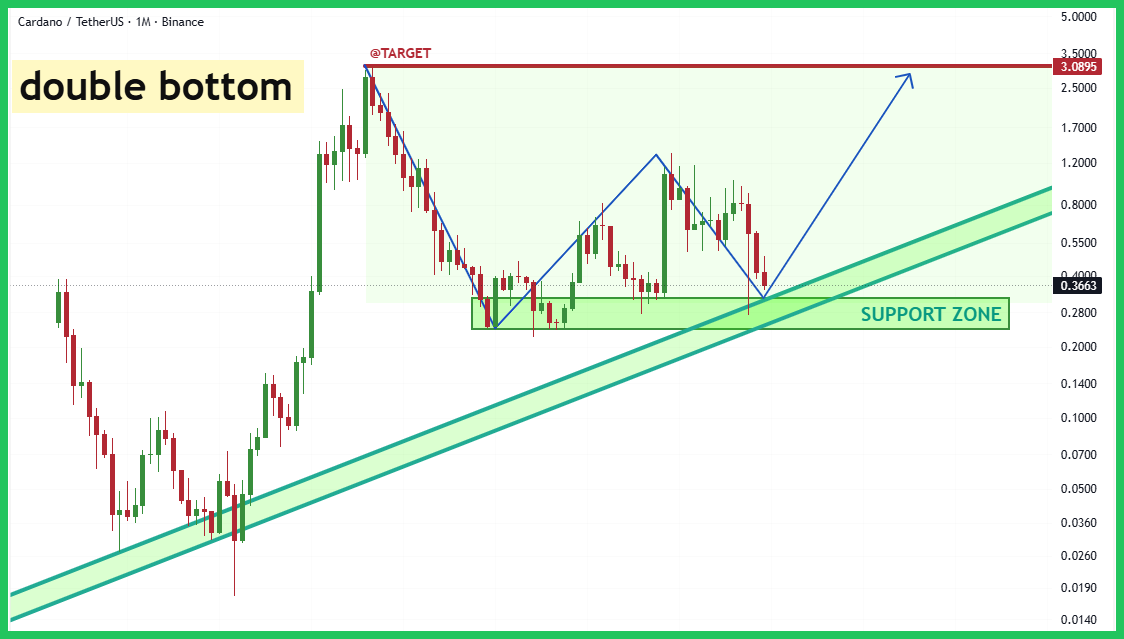 Ok anh em, cùng mổ xẻ chart $ADA cực ngon này xem có gì hay ho không nhé. Đây là cơ hội hiếm có để tích lũy Cardano cho chu kỳ Bull Run sắp tới. Trên khung thời gian tháng (1M), $ADA đã hình thành mô hình hai đáy rõ ràng, một dấu hiệu đảo chiều tăng giá mạnh mẽ sau một đợt điều chỉnh sâu. Giá hiện đang nằm trong vùng Hỗ trợ then chốt (SUPPORT ZONE) quanh $0.28 - $0.37. Điều quan trọng là vùng này còn trùng khớp với đường xu hướng tăng dài hạn. Đây là điểm vào lệnh lý tưởng. Nếu giá giữ vững trên $0.28, mục tiêu tiềm năng (TARGET) của mô hình hai đáy có thể vươn tới đỉnh cũ quanh $3.0895.