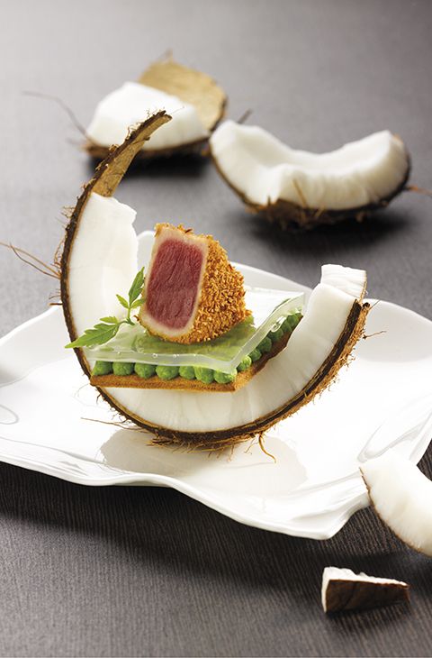 Goodmorning people!!!!!!!!!!!......Torniamo alla grande con un nuovo piatto dalle mille sensazioni COCONUT TUNA , questo è veramente un piatto prelibato che accosta il cocco al tonno sembrerebbe una cosa strana ma in realtà è sicuramente abbinamento più che giusto .... perchè voi direte?... beh!!... molto semplice! proviamo un attimo a pensare al gusto degli elementi associati cocco (sapore fresco e leggermente dolciastro) , tonno ( sapore deciso al quanto salino ) il tutto aggiustato in equilibrio con dei piselli scottati , un biscotto salato di chufa ed una gelatina di ron blanco .