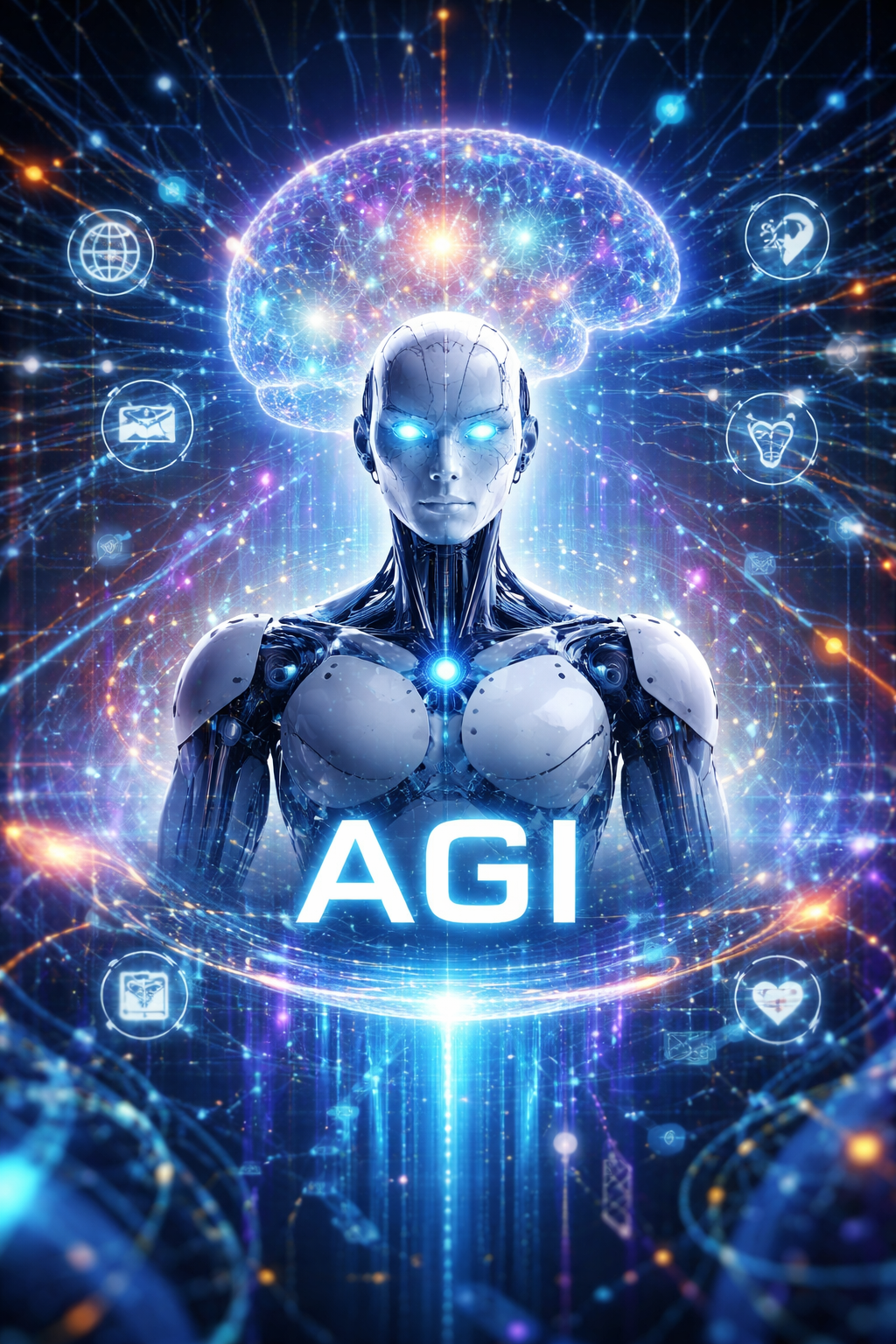 An Artificial General Intelligence (AGI) themed image typically depicts a highly advanced AI system capable of understanding and performing any intellectual task that a human can do. In such an image, a futuristic humanoid robot or a glowing digital brain is often shown at the center, surrounded by streams of data, neural network patterns, and holographic interfaces. The background may include elements like interconnected circuits, global communication networks, and floating symbols of science, technology, medicine, and education to represent AGI’s wide-ranging capabilities. Light effects and abstract patterns often suggest intelligence, learning, and rapid information processing. Overall, the image conveys the idea of a powerful, adaptable intelligence that bridges human cognition and advanced machine technology, symbolizing the future of innovation and the transformative potential of AGI in society. 🤖✨🧠