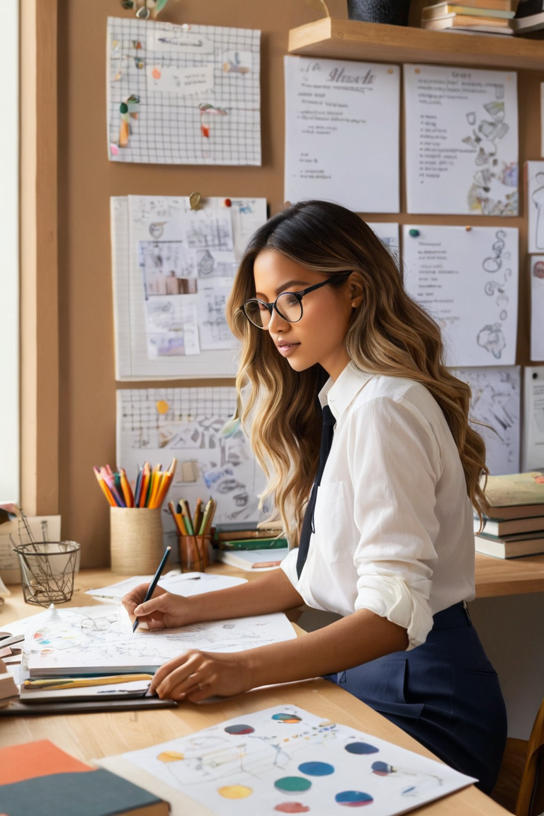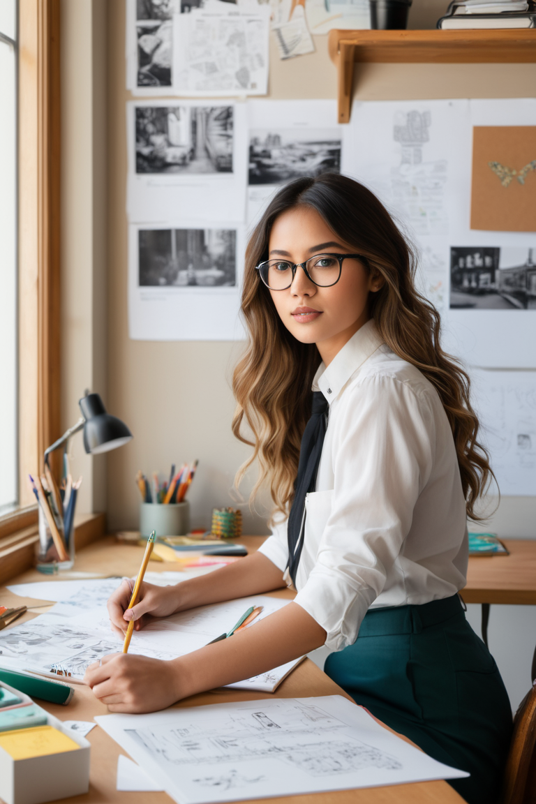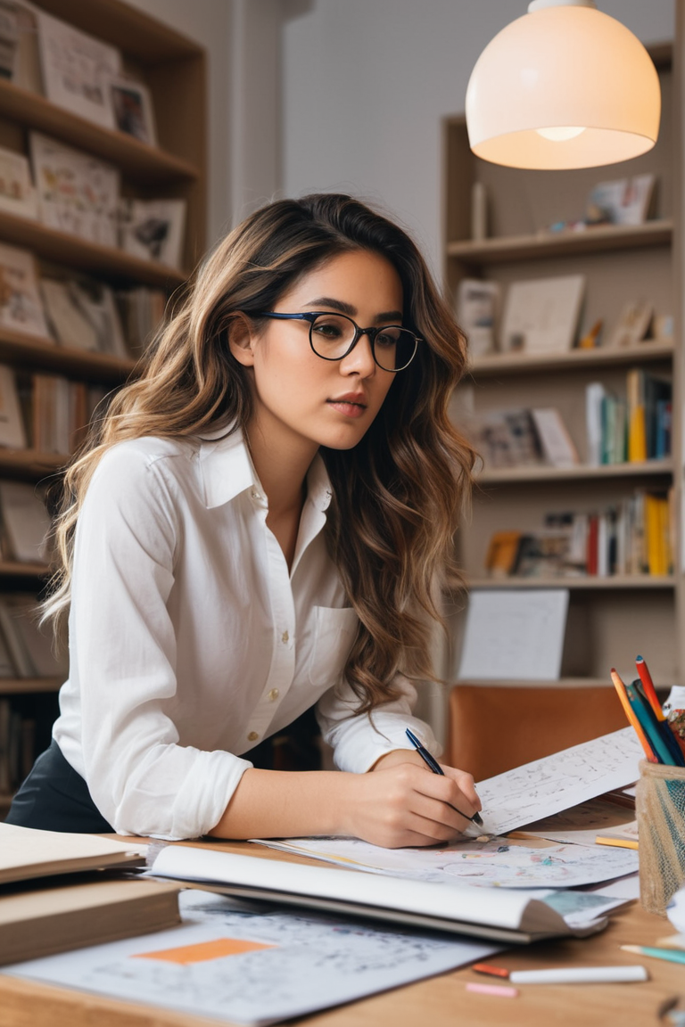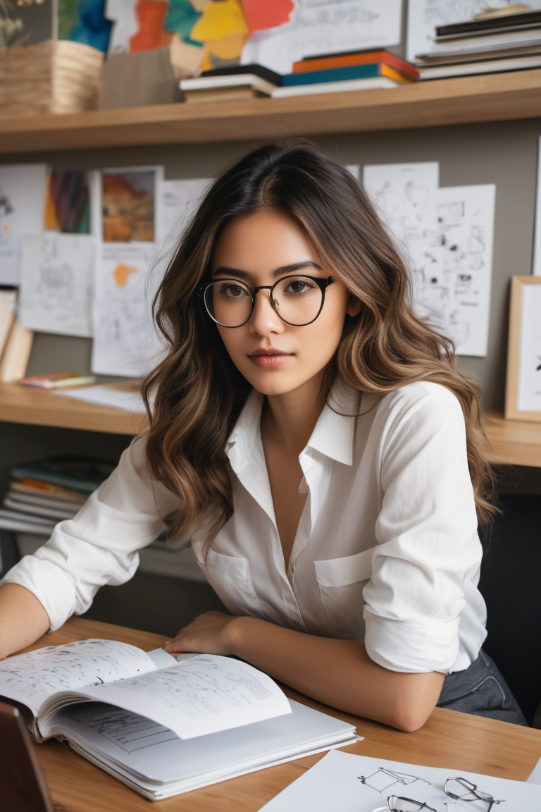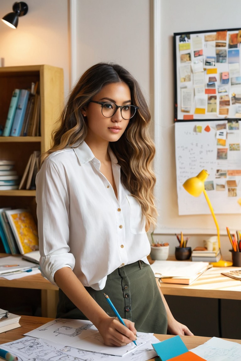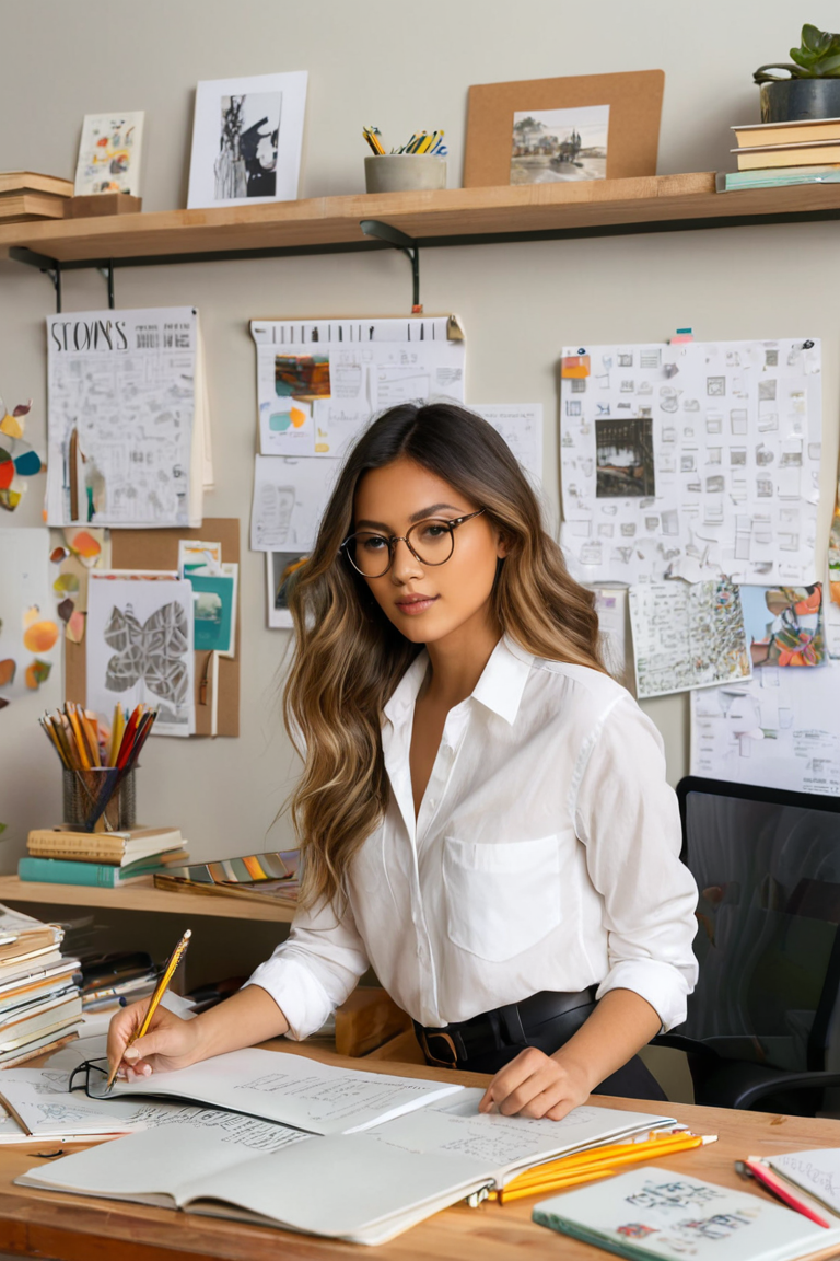 Illustrate a young woman working in an eclectic, creative study space filled with papers, sketches, and various notes pinned on the wall and scattered on the desk. She has long, wavy hair and wears stylish glasses, focusing intently on her work. She’s dressed in a casual outfit with a white button-up shirt slightly unbuttoned, paired with a pencil skirt. The atmosphere is cozy, with warm lighting streaming through a nearby window, casting soft shadows. The background is filled with shelves, books, and artistic supplies, creating a sense of an organized, vibrant workspace where creativity flows.