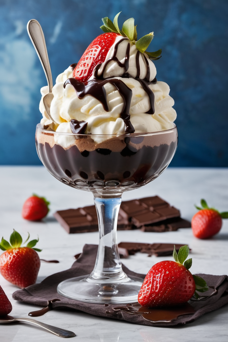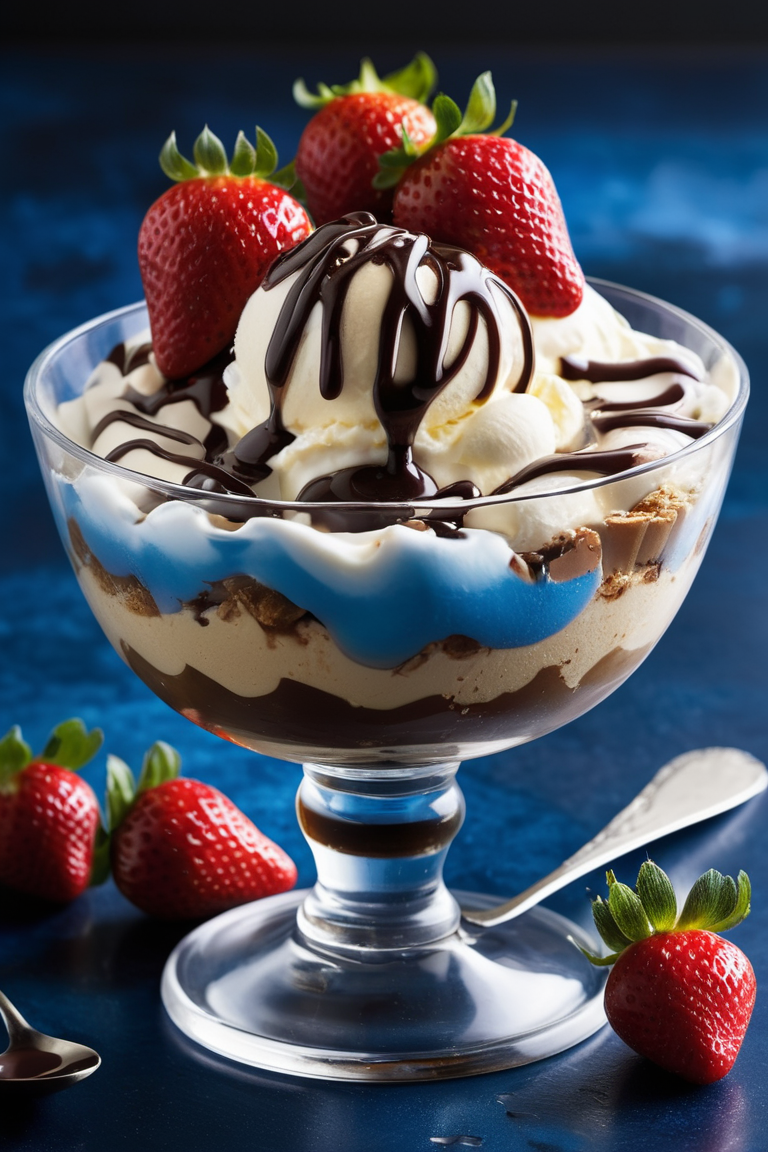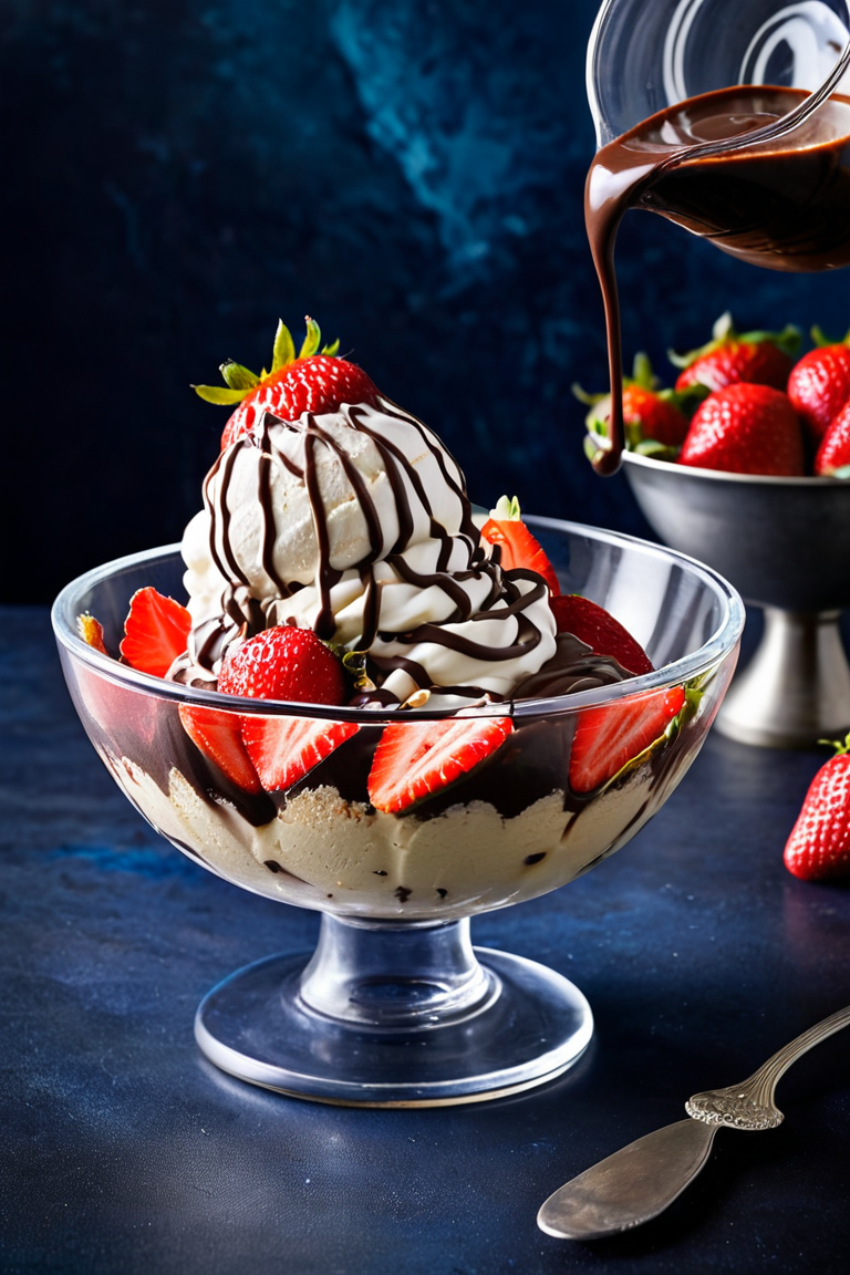 A luxurious vanilla ice cream sundae served in a crystal-clear glass bowl, topped with a generous drizzle of rich chocolate syrup cascading down the sides. The dessert is crowned with a fresh strawberry cut in half, placed delicately on top of whipped cream swirls. Additional whole strawberries, vibrant red and glistening with freshness, are scattered around on a marble countertop. The background features a deep, moody blue gradient, adding a dramatic contrast to the vibrant colors of the dessert. A small spoon with a dollop of chocolate syrup lies casually nearby, enhancing the inviting composition. The scene is lit with soft, diffused light, emphasizing the textures of the creamy ice cream, glossy syrup, and juicy strawberries.
