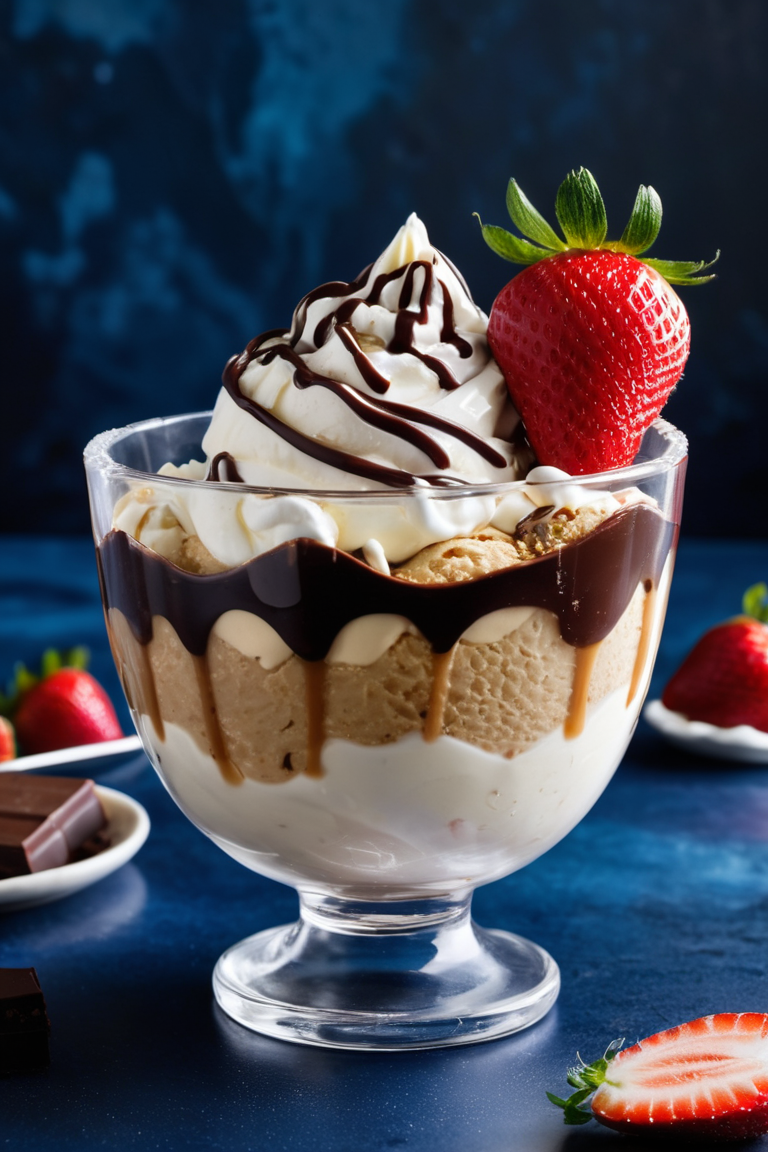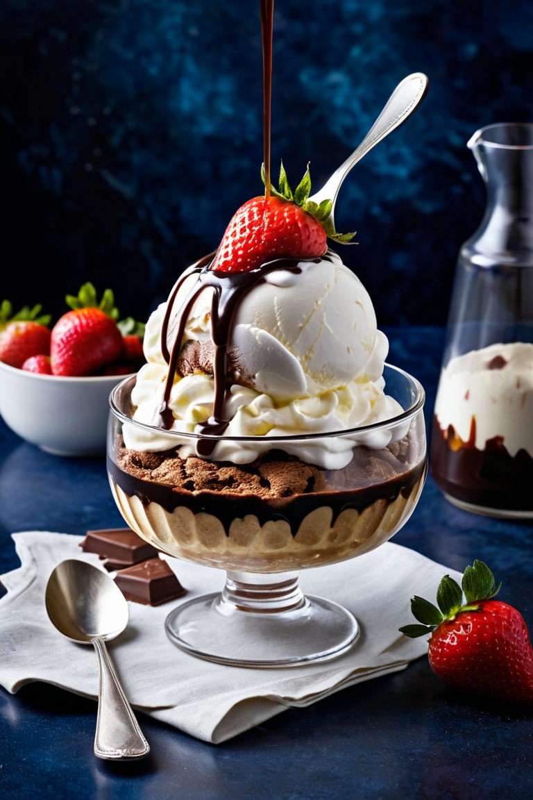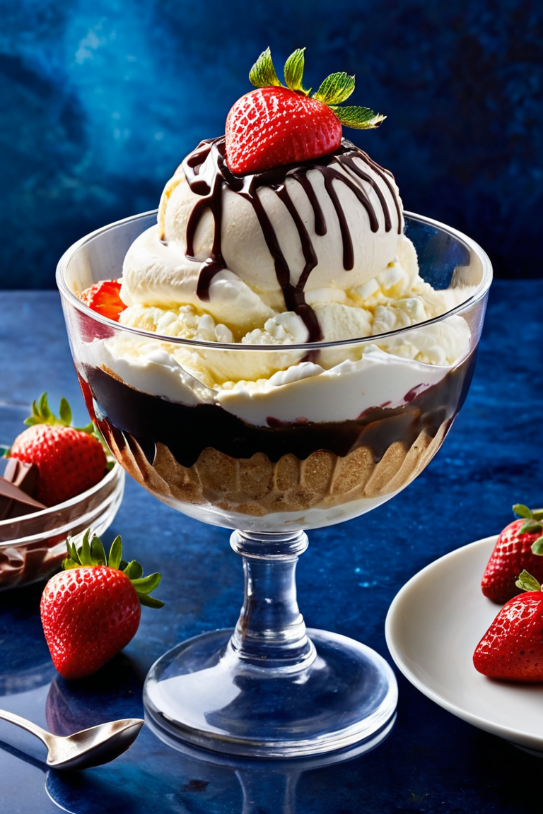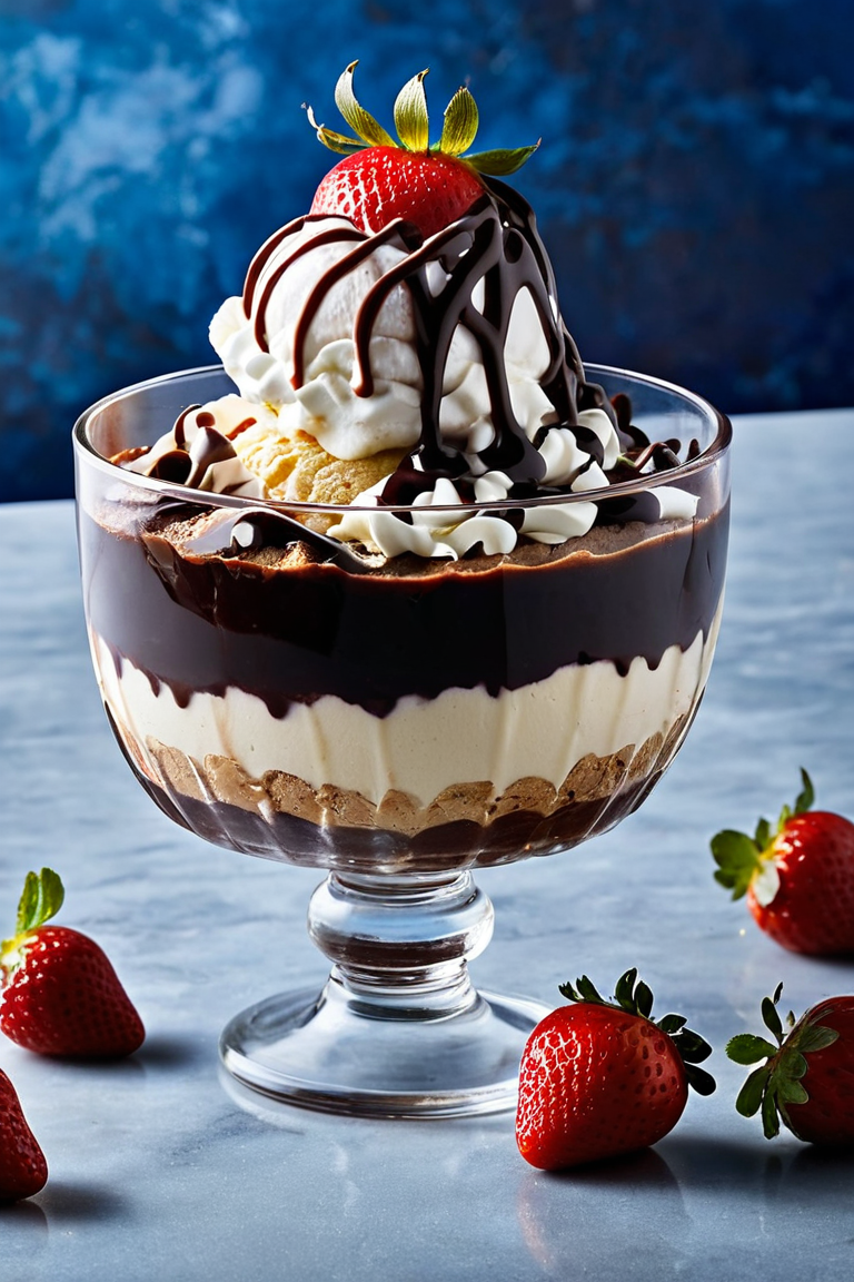 A luxurious vanilla ice cream sundae served in a crystal-clear glass bowl, topped with a generous drizzle of rich chocolate syrup cascading down the sides. The dessert is crowned with a fresh strawberry cut in half, placed delicately on top of whipped cream swirls. Additional whole strawberries, vibrant red and glistening with freshness, are scattered around on a marble countertop. The background features a deep, moody blue gradient, adding a dramatic contrast to the vibrant colors of the dessert. A small spoon with a dollop of chocolate syrup lies casually nearby, enhancing the inviting composition. The scene is lit with soft, diffused light, emphasizing the textures of the creamy ice cream, glossy syrup, and juicy strawberries.