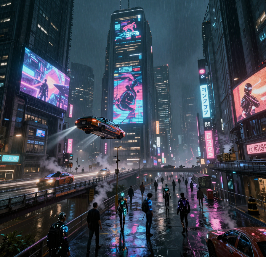 A sprawling cyberpunk metropolis at night, drenched in heavy rain. Towering brutalist skyscrapers covered in massive animated holographic advertisements and neon signs in Japanese and English. Flying vehicles with light trails weaving between buildings on multi-level highways. Below, crowded streets reflect the neon glow, filled with cyborgs, people with glowing techwear, and steam rising from vents. The aesthetic is gritty, detailed, dystopian, Blade Runner vibe. Cinematic lighting, volumetric fog, 8k resolution, highly detailed, photorealistic, Unreal Engine 5 render.