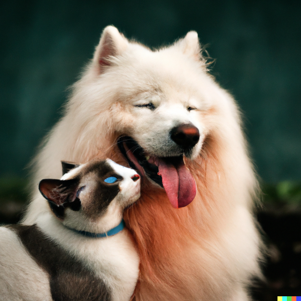 A photo of a Samoyed dog with its tongue out hugging a white Siamese cat : Above