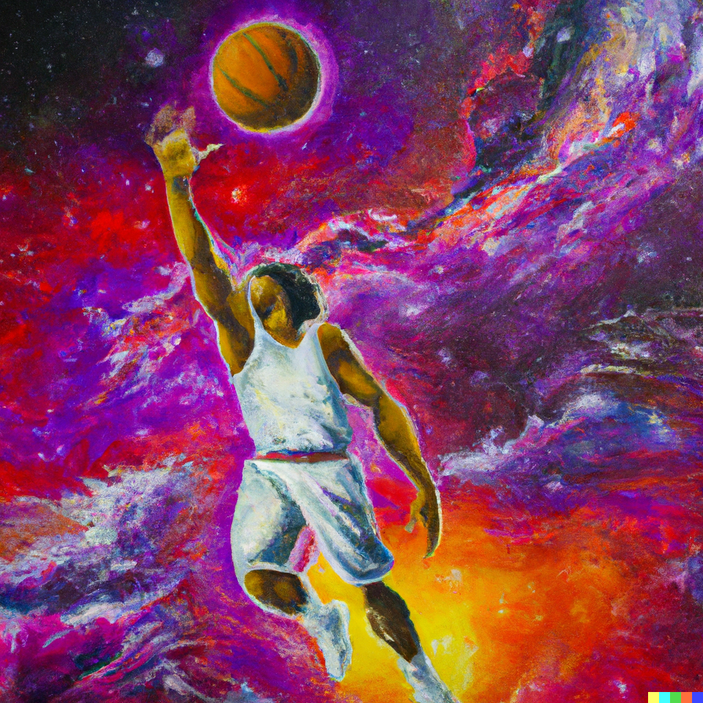 An expressive oil painting of a basketball player dunking, depicted as an explosion of a nebula : Above