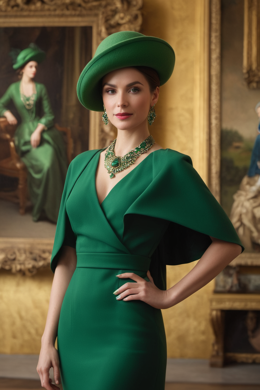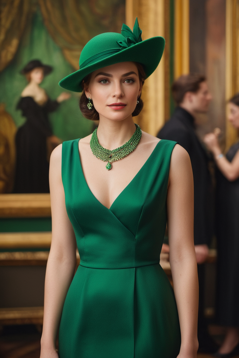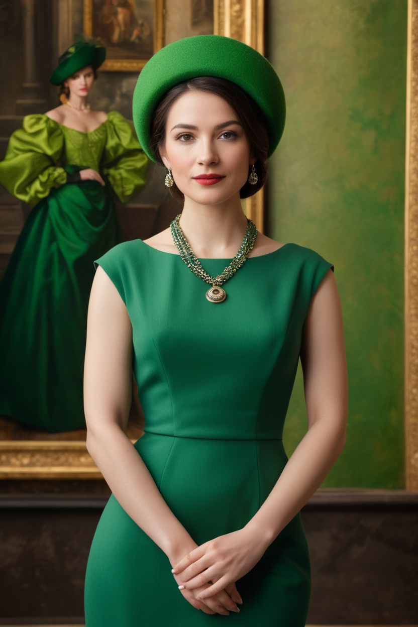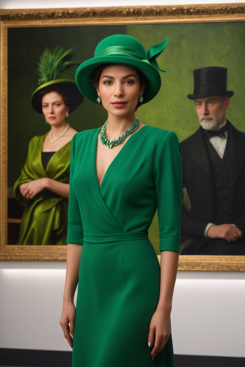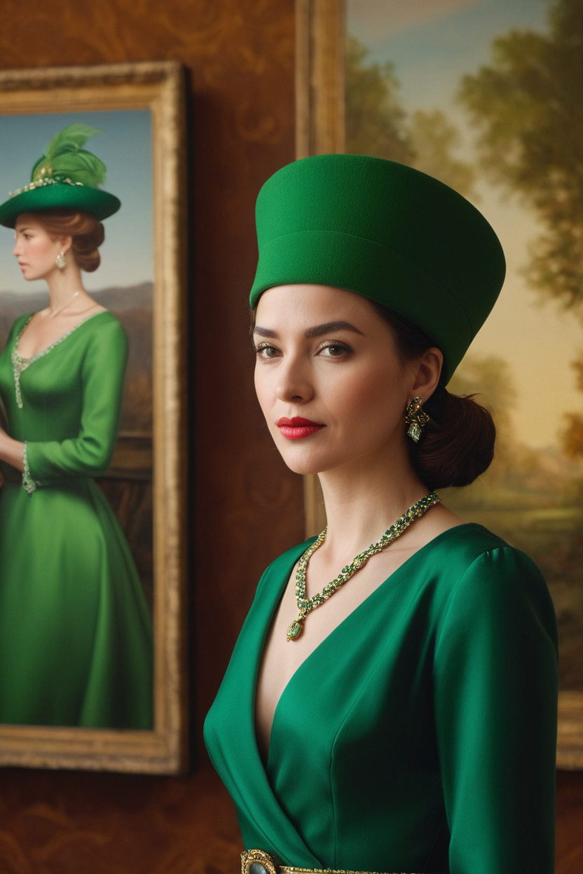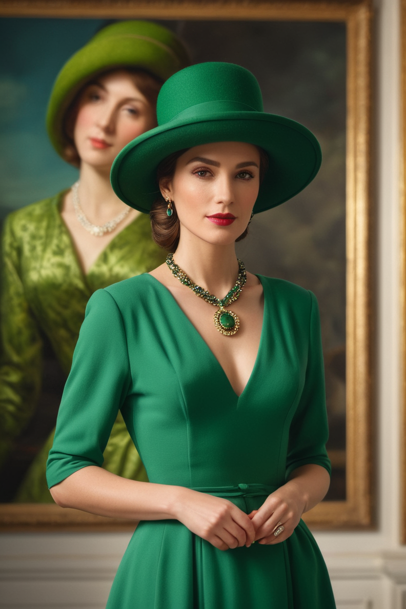 The image features a woman wearing a green hat and a green dress, standing in front of a painting. She appears to be looking at the viewer, possibly posing for a portrait. The woman is wearing a necklace, adding a touch of elegance to her outfit. The painting in the background complements the woman's attire, creating a visually appealing scene.