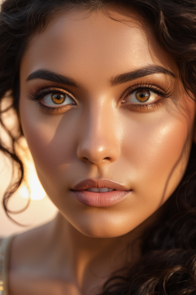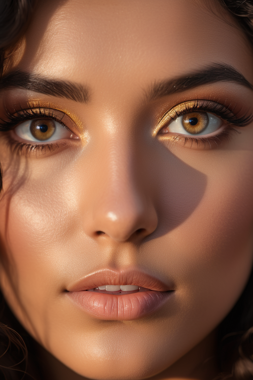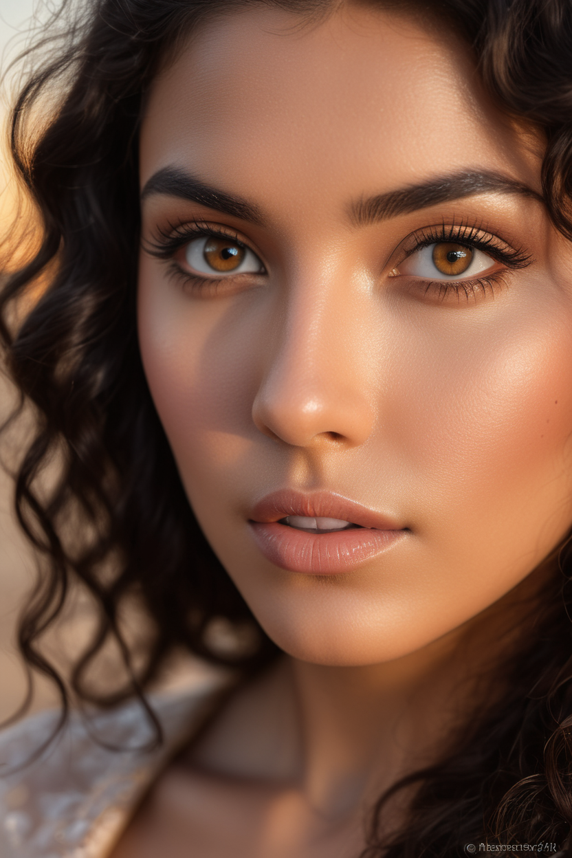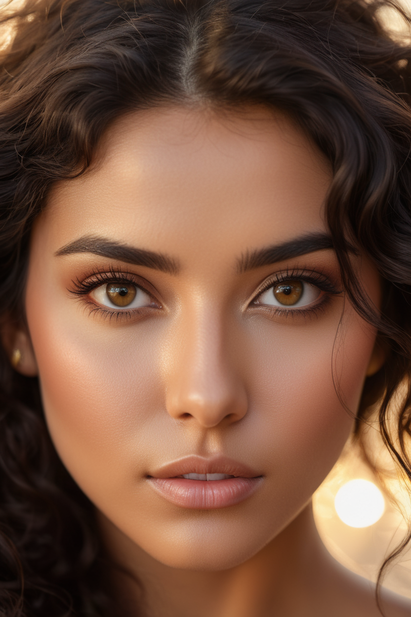 extreme close up of detailed eyes, photographic 35mm shot, goddess & temptess, candid, golden hour, cinematic lightning, extreme realism , realistic, black wavy hair, brown eyes, pastel-colored background, The image, captured in stunning Ultra HD, Nikon D850