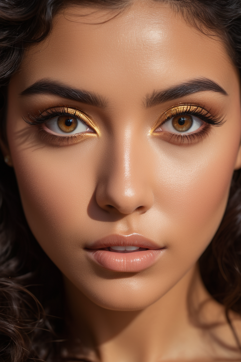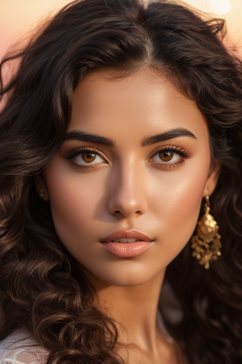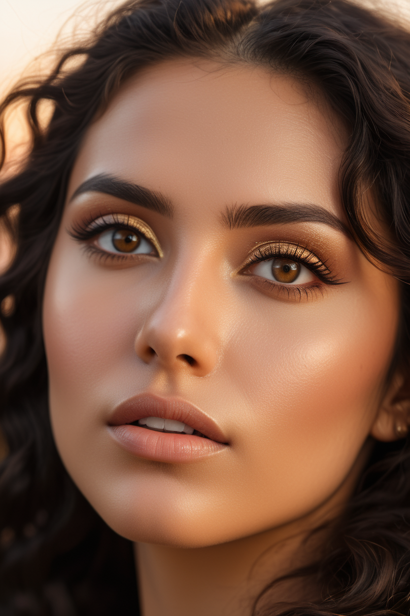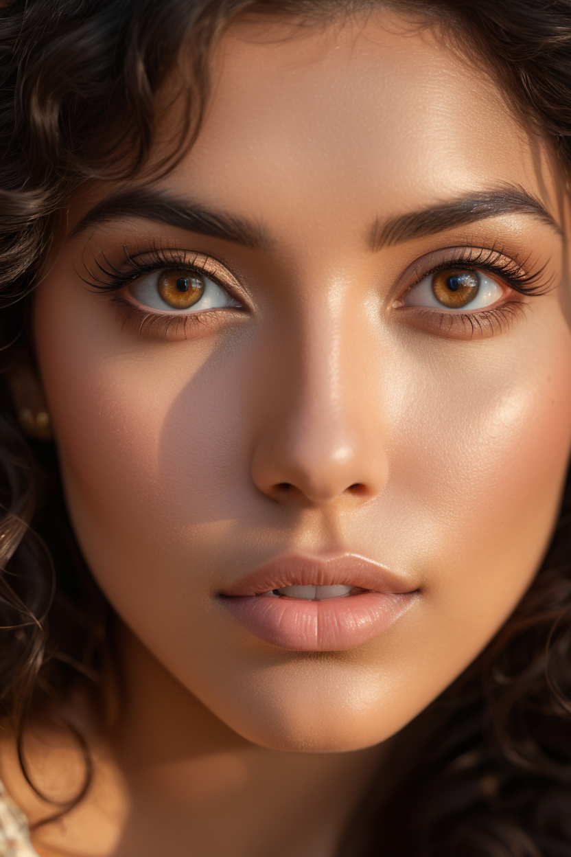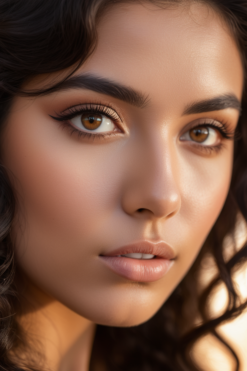 extreme close up of detailed eyes, photographic 35mm shot, goddess & temptess, candid, golden hour, cinematic lightning, extreme realism , realistic, black wavy hair, brown eyes, pastel-colored background, The image, captured in stunning Ultra HD, Nikon D850