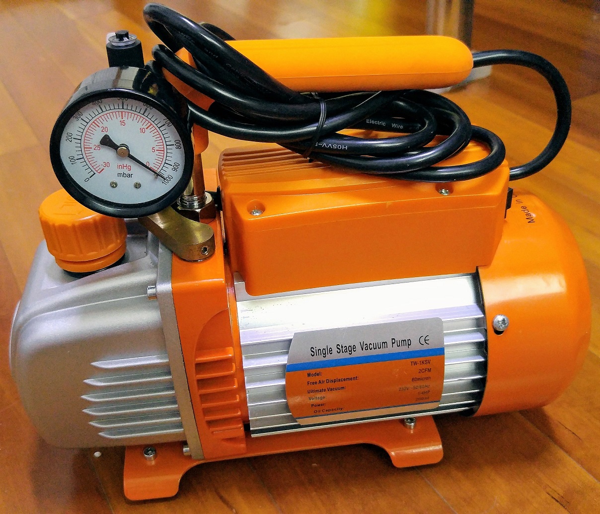 ↑ 진공 펌프(용량 2CFM: 72L/h, 소비 전력: 약 110Wh, 가격: 13만원, 밸브장착호스:7천원, 연장호스: 9천원)