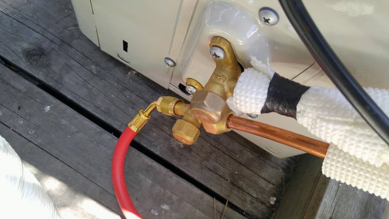 ↑ 실외기 설치 및 실내/외기 배관 연결 후 서비스 포트를 통해 배관 내 진공 작업 중...