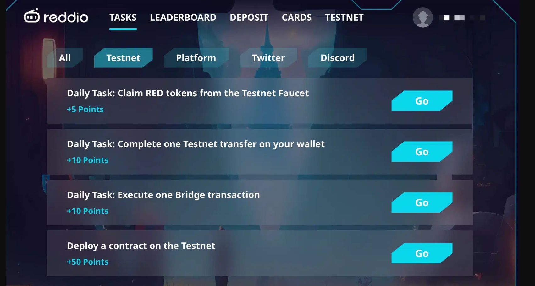 Collect Reddio Points in your dashboard after completing tasks.