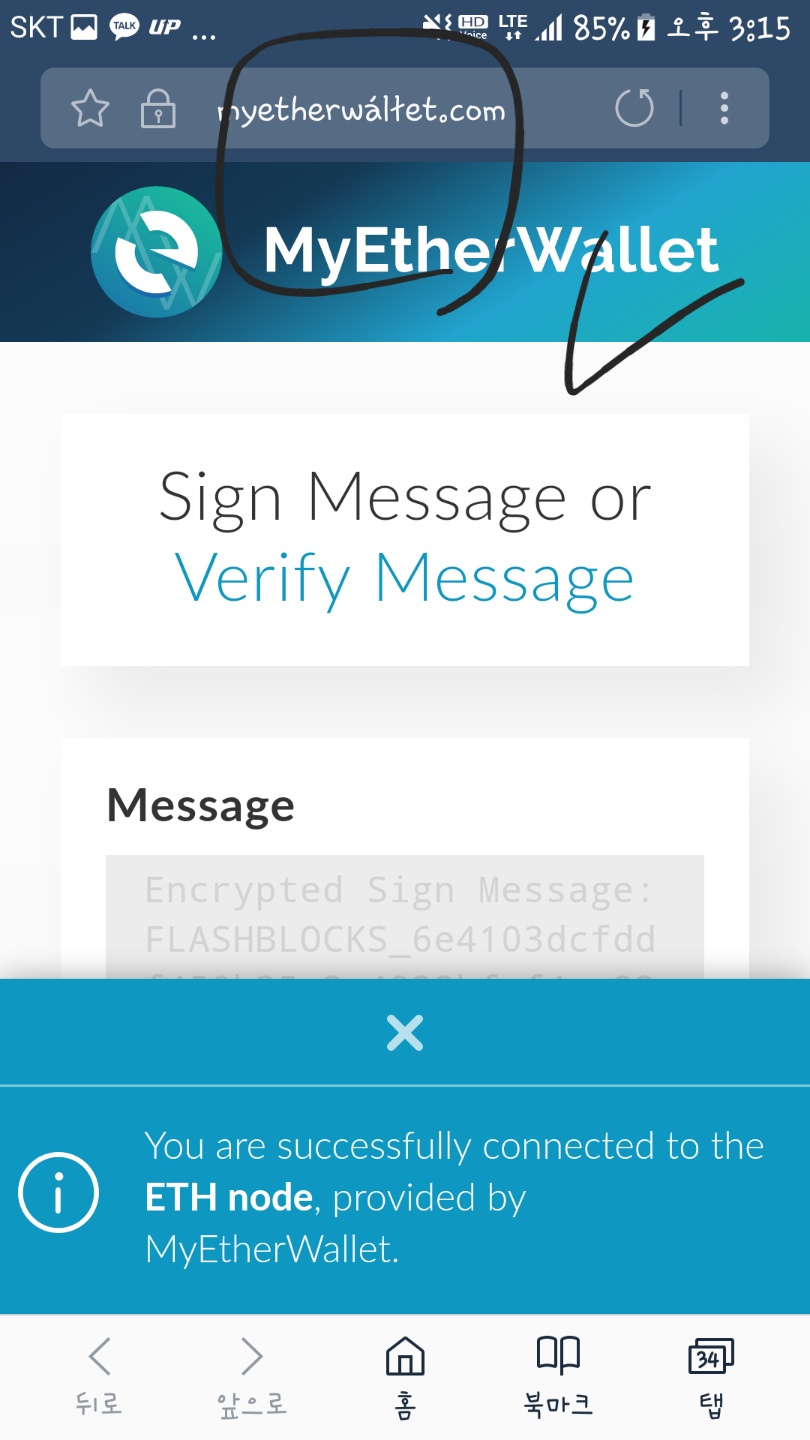myetherwallet.com으로 보이지만 복사해서 택스트 붙이기로 확인해보면
