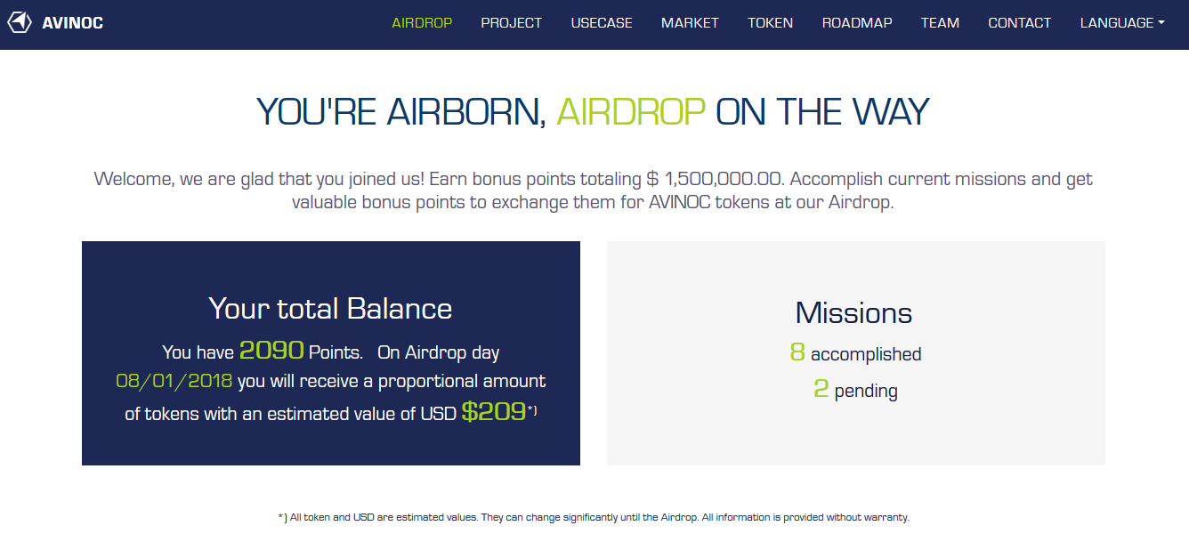 AVINOC is doing a unique airdrop of it's own kind, where users have to complete missions in order to redeem tokens on Airdrop Distribution Day, on the 1st of August 2018.