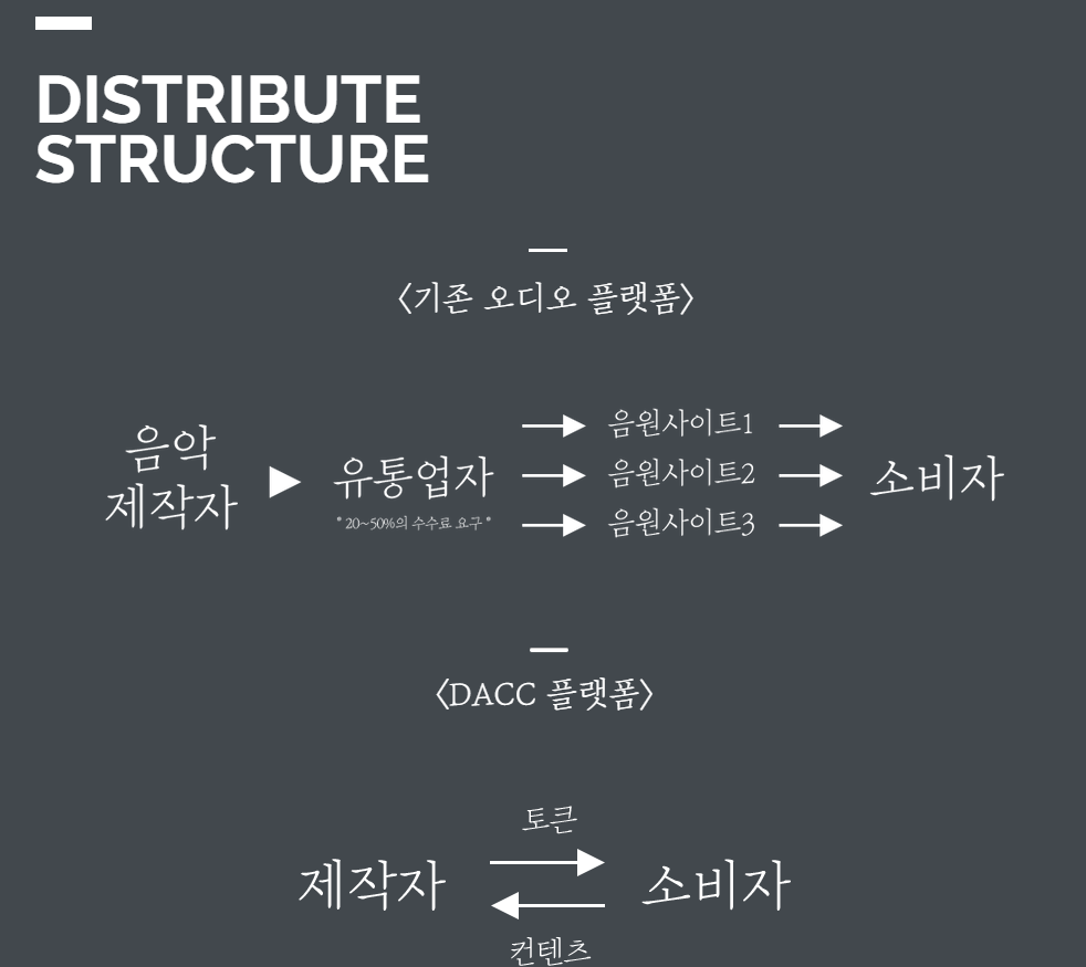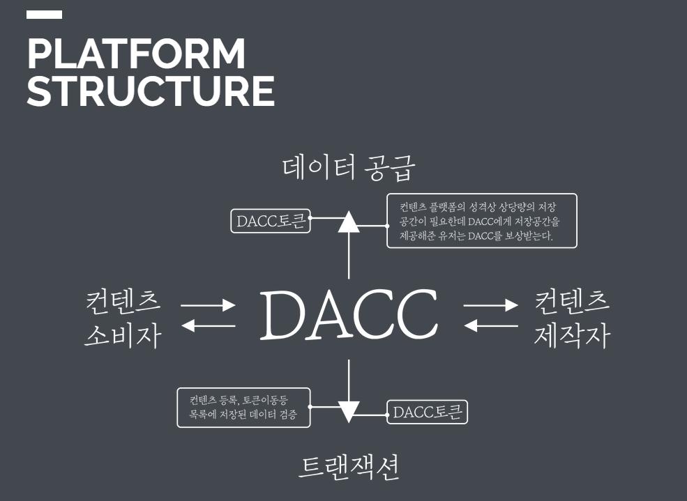 즉, 컨텐츠 공급과 관련된 생태계를 꾸려나가고자 하는게 플랫폼의 목적입니다. 구조는 아래와 같은데요. 주 보상구조가 DACC으로 주어지게 되어있습니다.