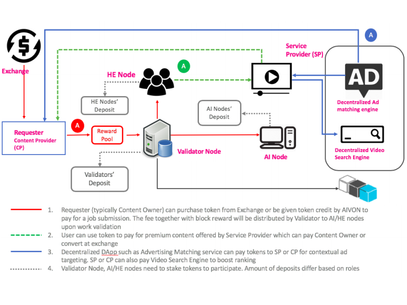 Aivon is being developed on a hybrid blockchain foundation consisting of the Ethereum Mainnet used to support its native AVO token and the Plasma Network that will underpin the core platform. To classify their videos and receive metadata, content providers would need to upload them on the platform and offer an AVO reward pool, optionally making use of Aivon's token credit program. Each video will be divided into clips that will be assigned unique identities and analysed by a convolutional neural network consisting of computer vision and machine learning algorithms. This network will be distributed between AI Nodes being ran by ordinary users in exchange for a share of the AVO rewards. When necessary, the algorithms will be assisted by a network of freelance human experts, who will help with such tasks as transcriptions, translations, preliminary verifications and assigning more complex types of metadata and will receive AVO based on the quantity and quality of their contributions. Users could also stake AVO to run Validator Nodes, which will coordinate the network, assign tasks to human and AI participants, verify the end results and ensure the distribution of rewards through a proof-of-stake algorithm. They will also receive rewards but risk losing some of their staked tokens if they end up going against the final consensus.