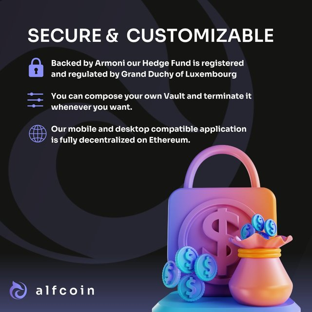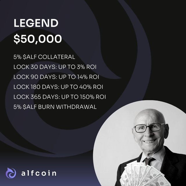 To jump into our 4 different plans (vaults), investors need to lock a StableCoin amount and an $ALF collateral for a certain period of time. Yields will naturally vary depending on the token lock duration and the amount of money locked. When the period is over, investors get their money + yield back, and we burn 5% of the $ALF collateral in the process. Investors can withdraw their money before the end of their lock period with no interests resulting in a 30% fine from the system.
